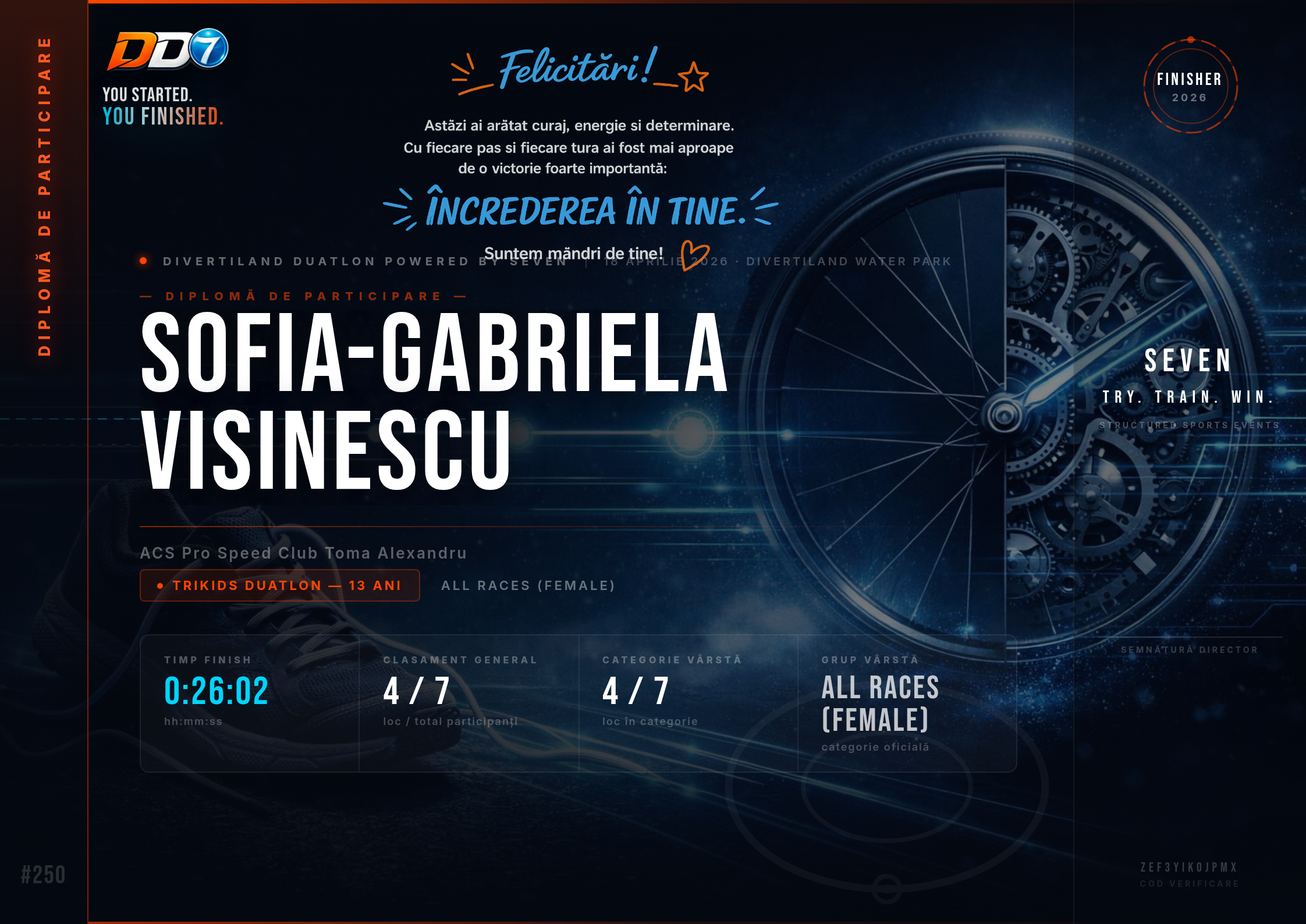 | 4 | Sofia-Gabriela Visinescu | TRIKids 13 Ani | F | 250 | 0:05:11 | 0:00:41 | 0:15:54 | 0:04:17 | 0:26:02 | 📜 |