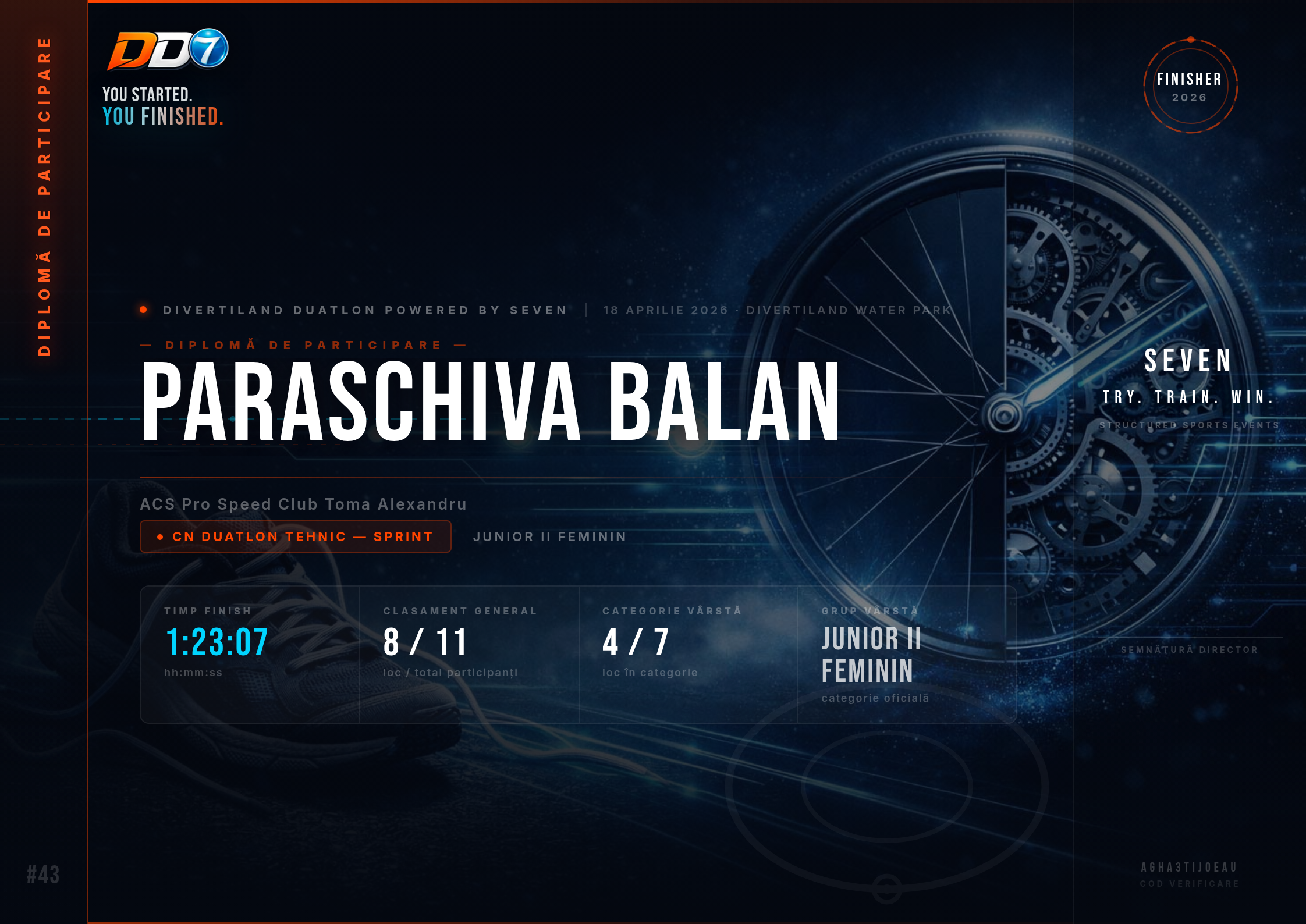 | 4 | 43 | Paraschiva Balan | Junior II Feminin | CN Duatlon Tehnic - Sprint | F | 0:11:56 | 0:00:49 | 0:24:26 | 0:00:28 | 0:26:13 | 0:00:20 | 0:10:30 | 0:08:29 | 1:23:07 | 📜 |