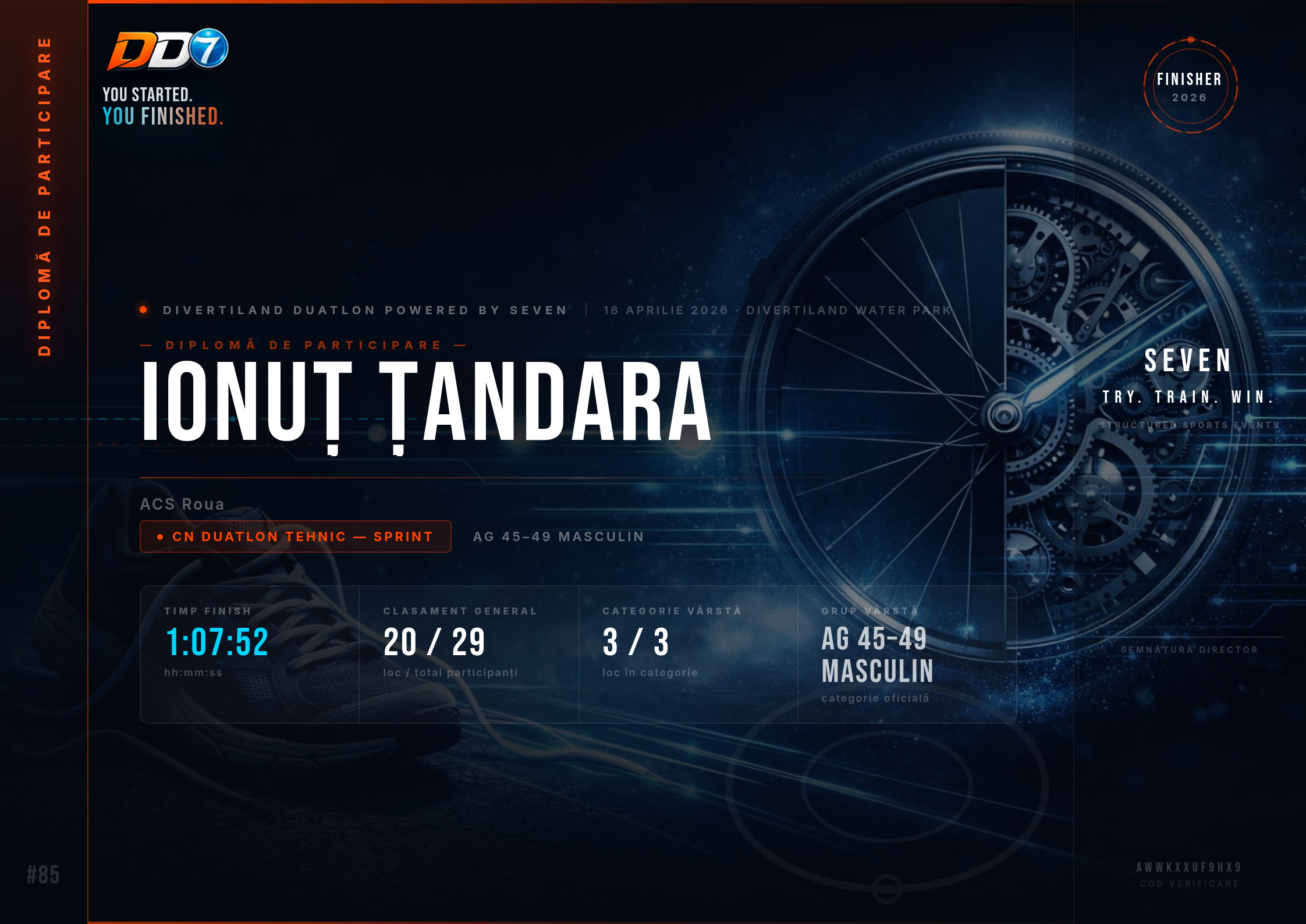 | 3 | 85 | Ionuț Țandără | AG 45–49 Masculin | CN de Duatlon Tehnic - Sprint AG | M | 0:09:32 | 0:01:14 | 0:17:48 | 0:01:12 | 0:11:02 | 0:01:03 | 0:18:51 | 0:07:14 | 1:07:52 | 📜 |