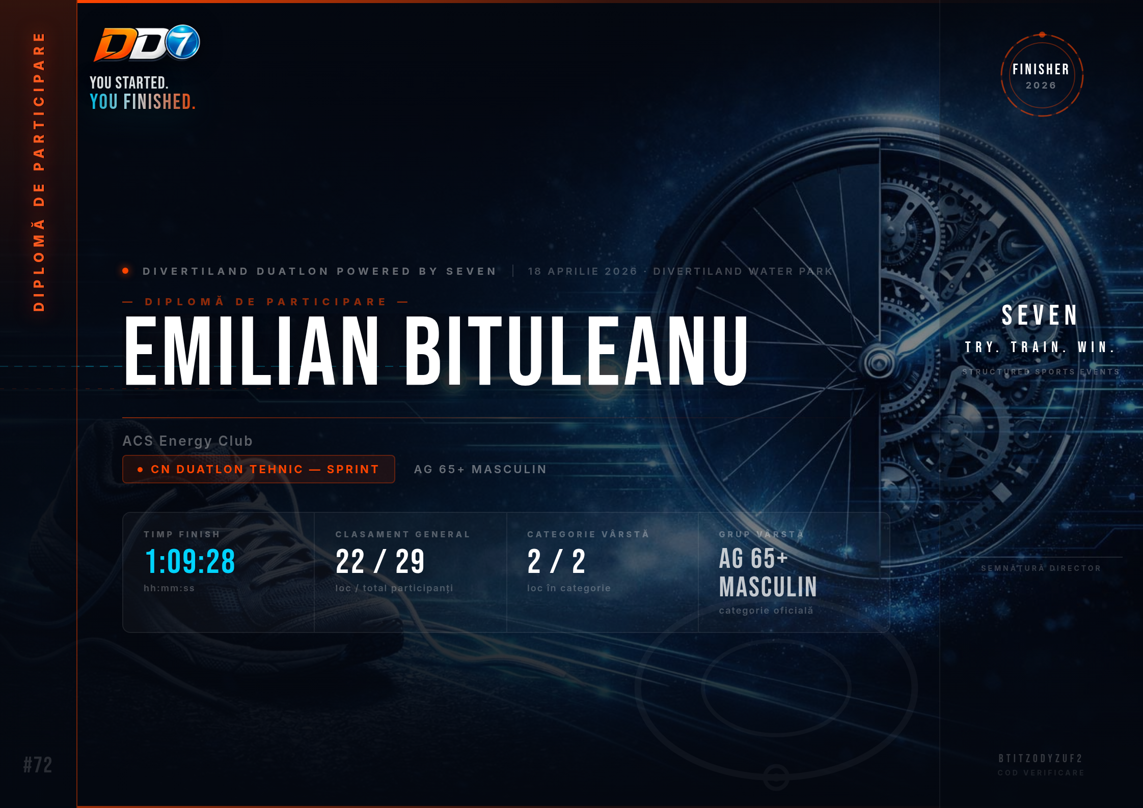 | 2 | 72 | Emilian Bituleanu | AG 65+ Masculin | CN de Duatlon Tehnic - Sprint AG | M | 0:11:13 | 0:00:50 | 0:17:29 | 0:00:49 | 0:12:11 | 0:00:56 | 0:18:29 | 0:07:36 | 1:09:28 | 📜 |
