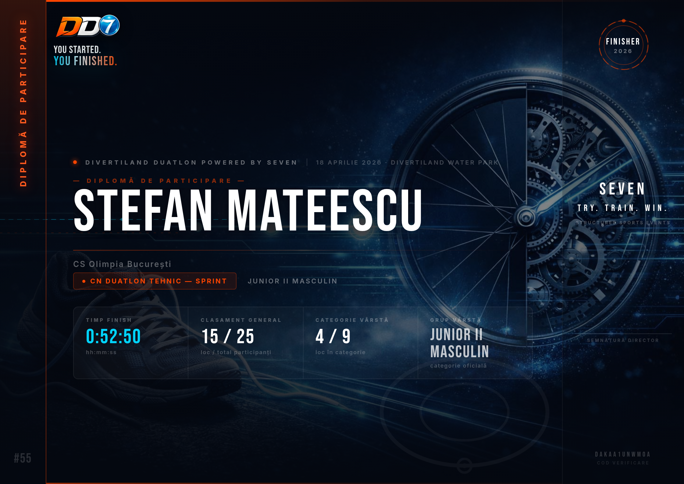 | 4 | 55 | Stefan Mateescu | Junior II Masculin | CN Duatlon Tehnic - Sprint | M | 0:07:32 | 0:00:36 | 0:14:45 | 0:00:34 | 0:08:41 | 0:00:38 | 0:14:40 | 0:05:27 | 0:52:50 | 📜 |