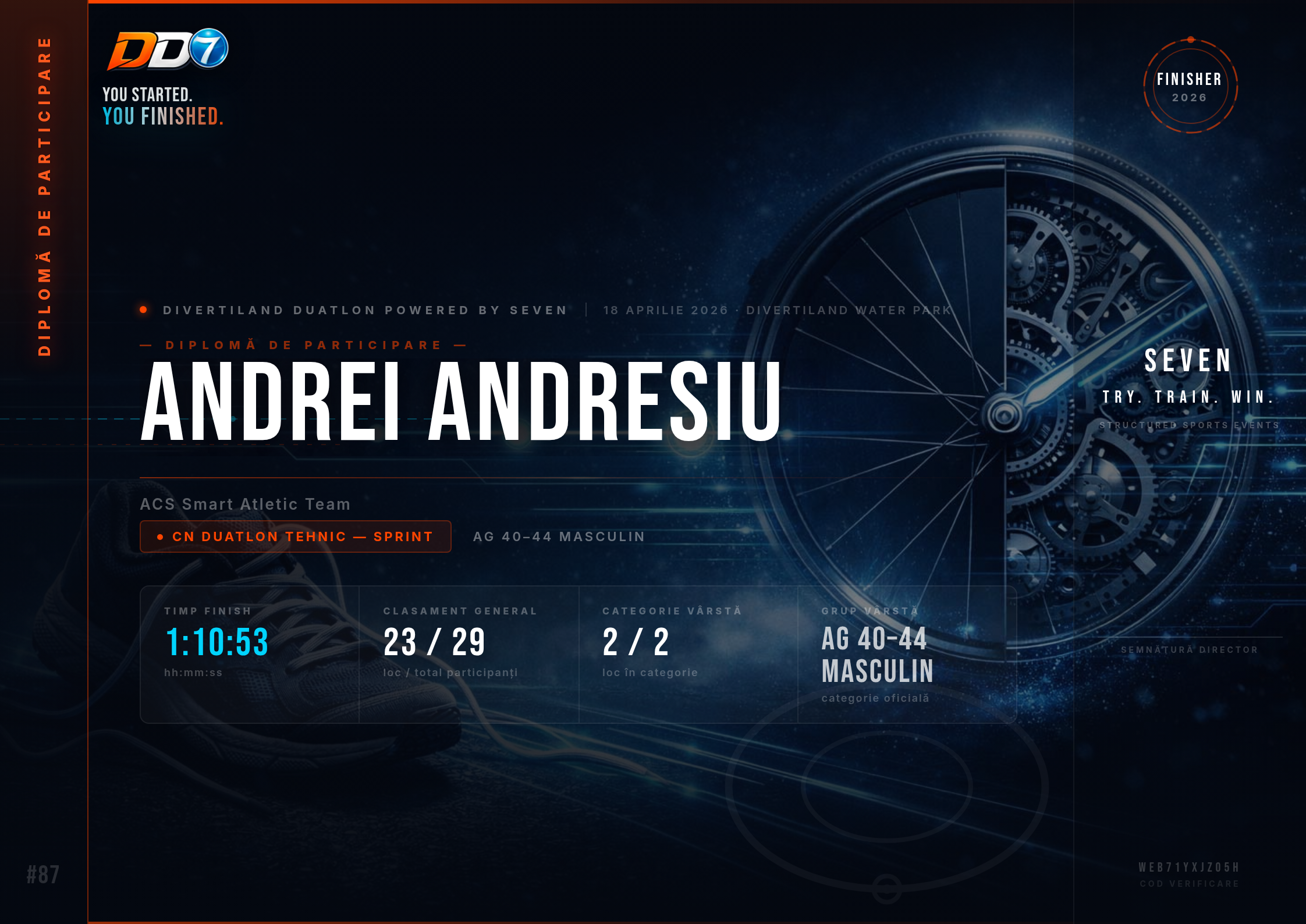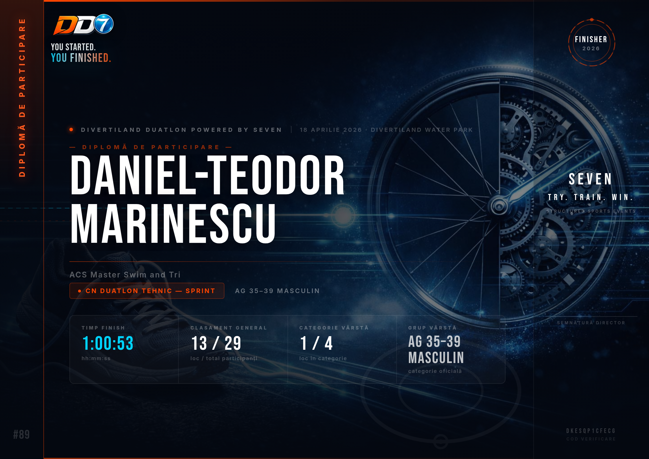 | 1 | 89 | Daniel-Teodor Marinescu | AG 35–39 Masculin | CN de Duatlon Tehnic - Sprint AG | M | 0:08:46 | 0:01:02 | 0:16:45 | 0:00:54 | 0:09:22 | 0:01:01 | 0:17:19 | 0:05:48 | 1:00:53 | 📜 |