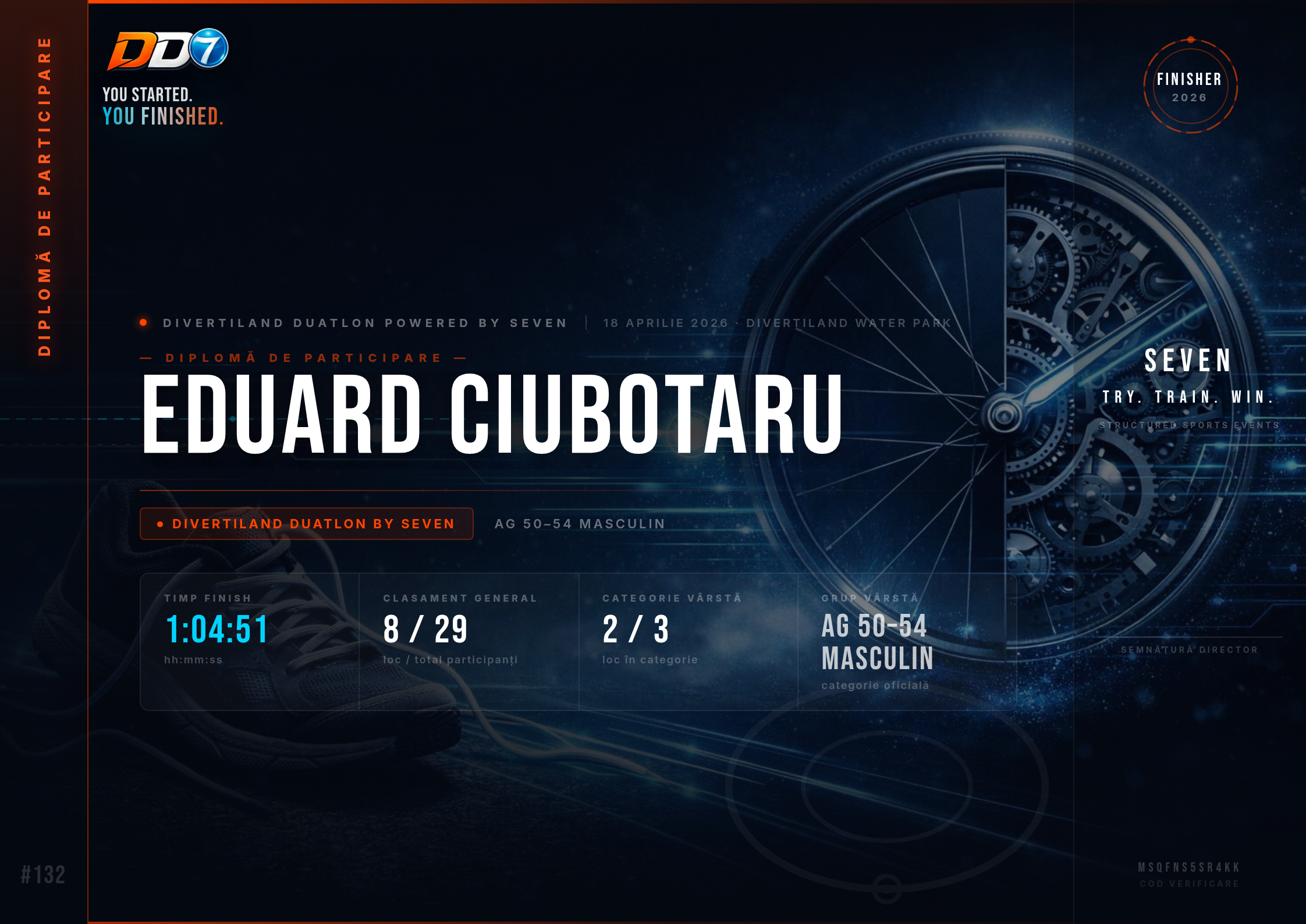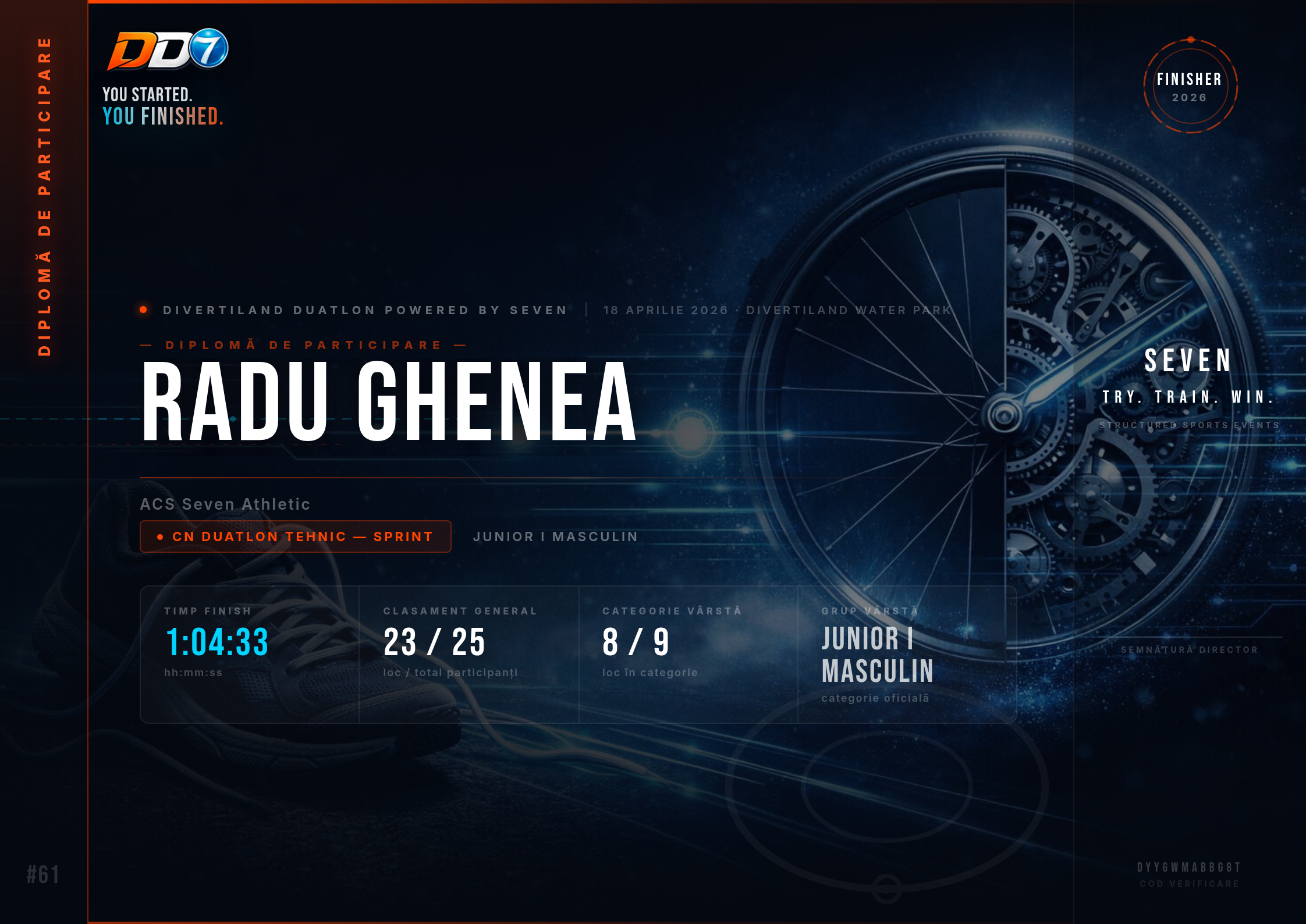 | 8 | 61 | Radu Ghenea | Junior I Masculin | CN Duatlon Tehnic - Sprint | M | 0:08:57 | 0:00:45 | 0:17:41 | 0:00:44 | 0:11:04 | 0:00:48 | 0:17:53 | 0:06:44 | 1:04:33 | 📜 |