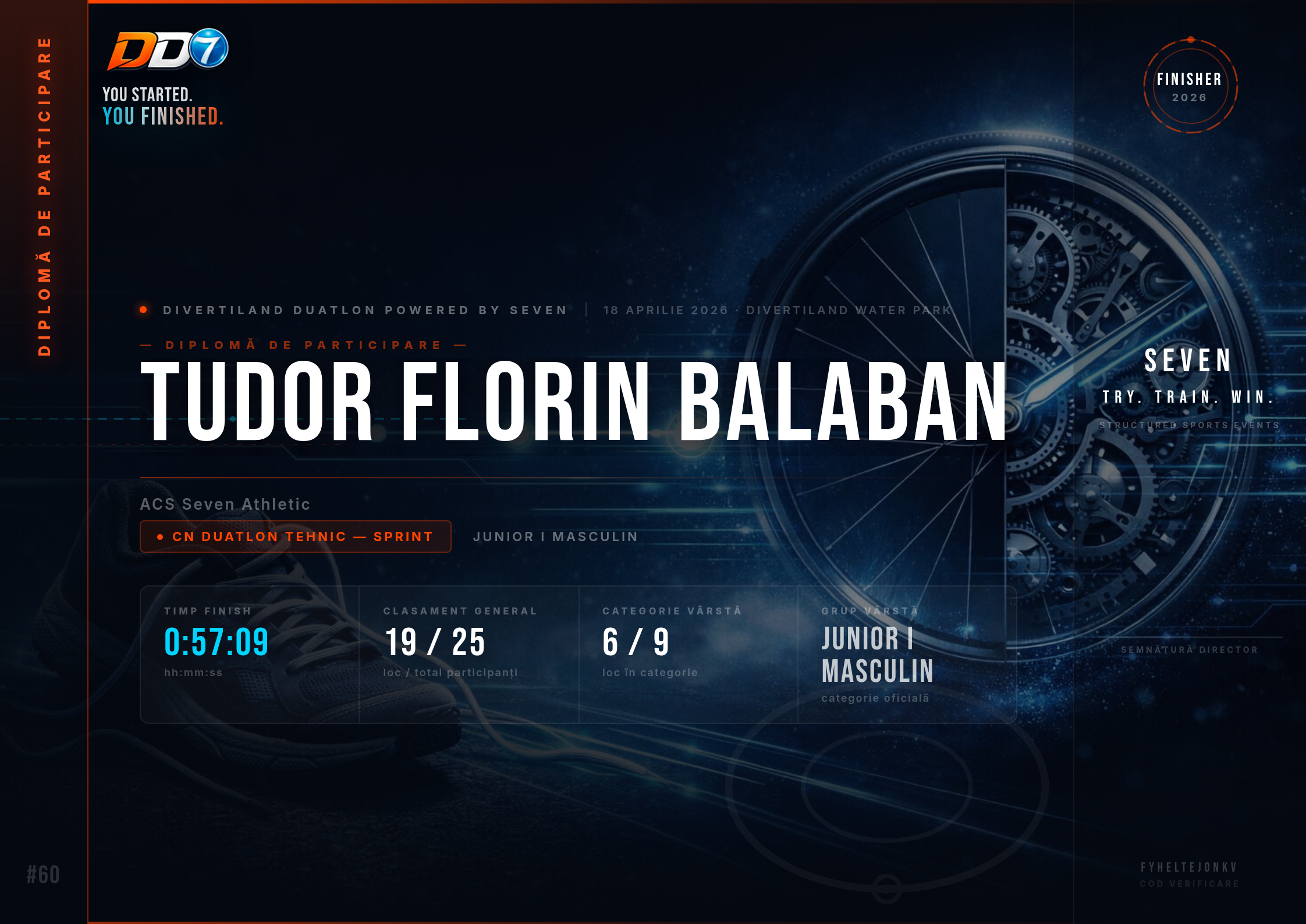 | 6 | 60 | Tudor Florin Balaban | Junior I Masculin | CN Duatlon Tehnic - Sprint | M | 0:07:55 | 0:00:42 | 0:15:47 | 0:00:44 | 0:09:20 | 0:00:46 | 0:16:16 | 0:05:42 | 0:57:09 | 📜 |
