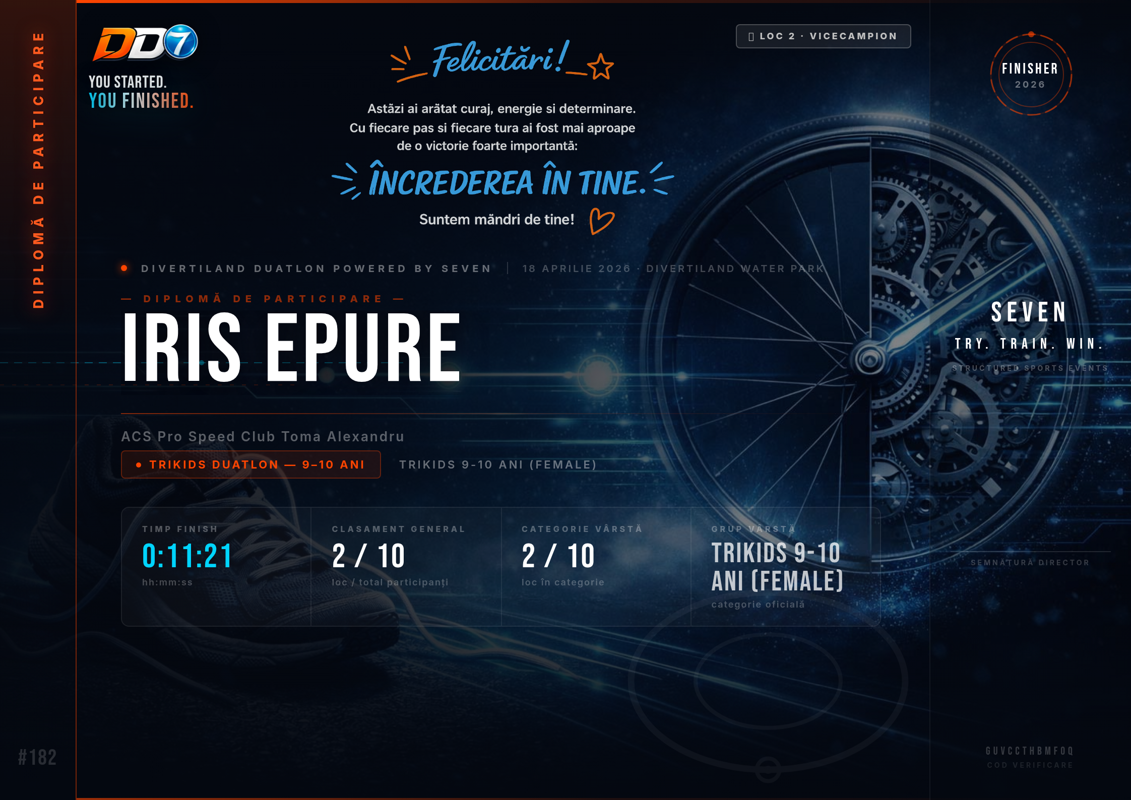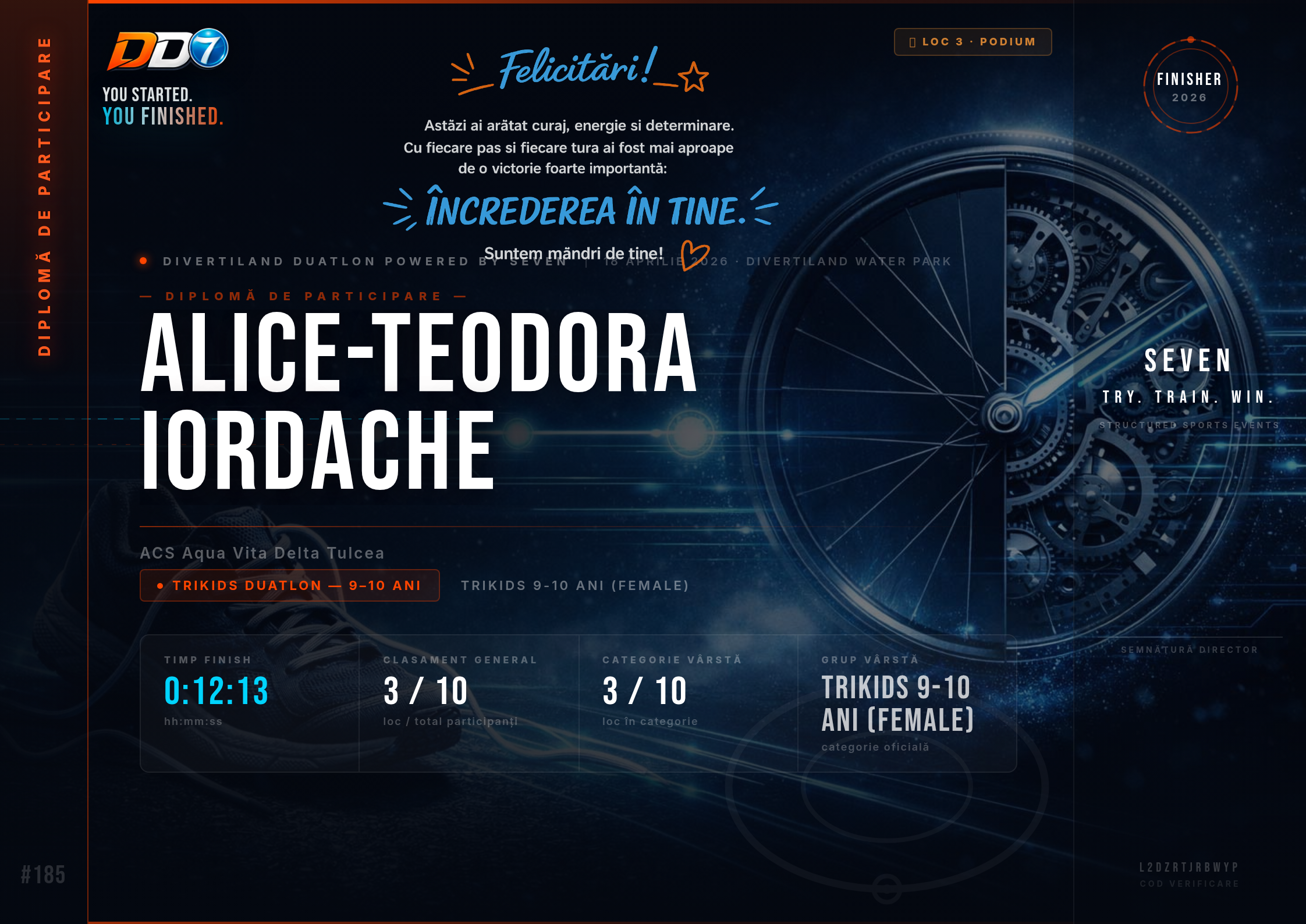| 3 | Alice-Teodora Iordache | F | TRIKids 9-10 Ani | 185 | 0:01:39 | 0:00:43 | 0:07:51 | 0:02:01 | 0:12:13 | 📜 |