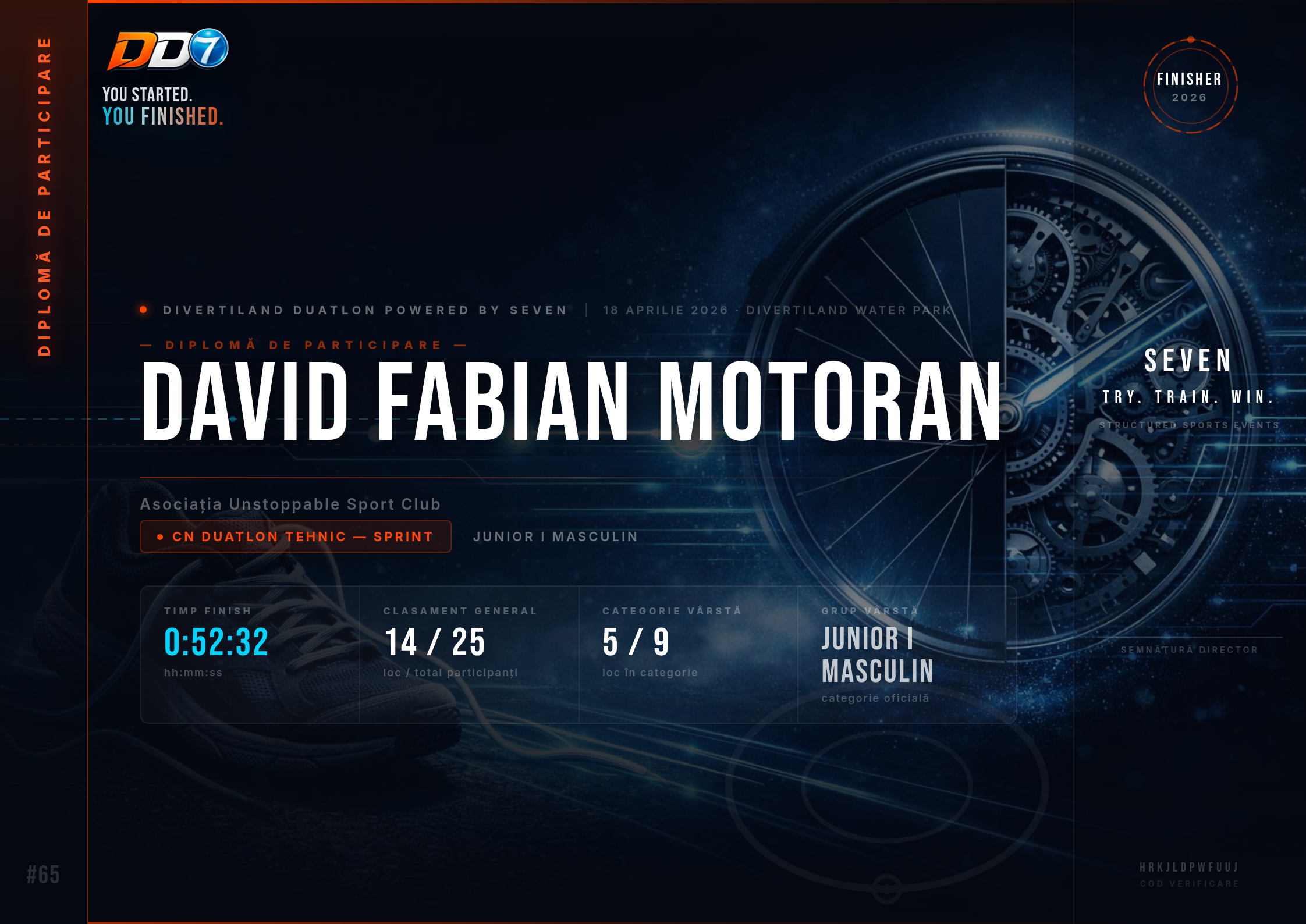 | 5 | 65 | David Fabian Motoran | Junior I Masculin | CN Duatlon Tehnic - Sprint | M | 0:07:15 | 0:00:56 | 0:14:31 | 0:00:48 | 0:08:34 | 0:00:58 | 0:14:25 | 0:05:09 | 0:52:32 | 📜 |