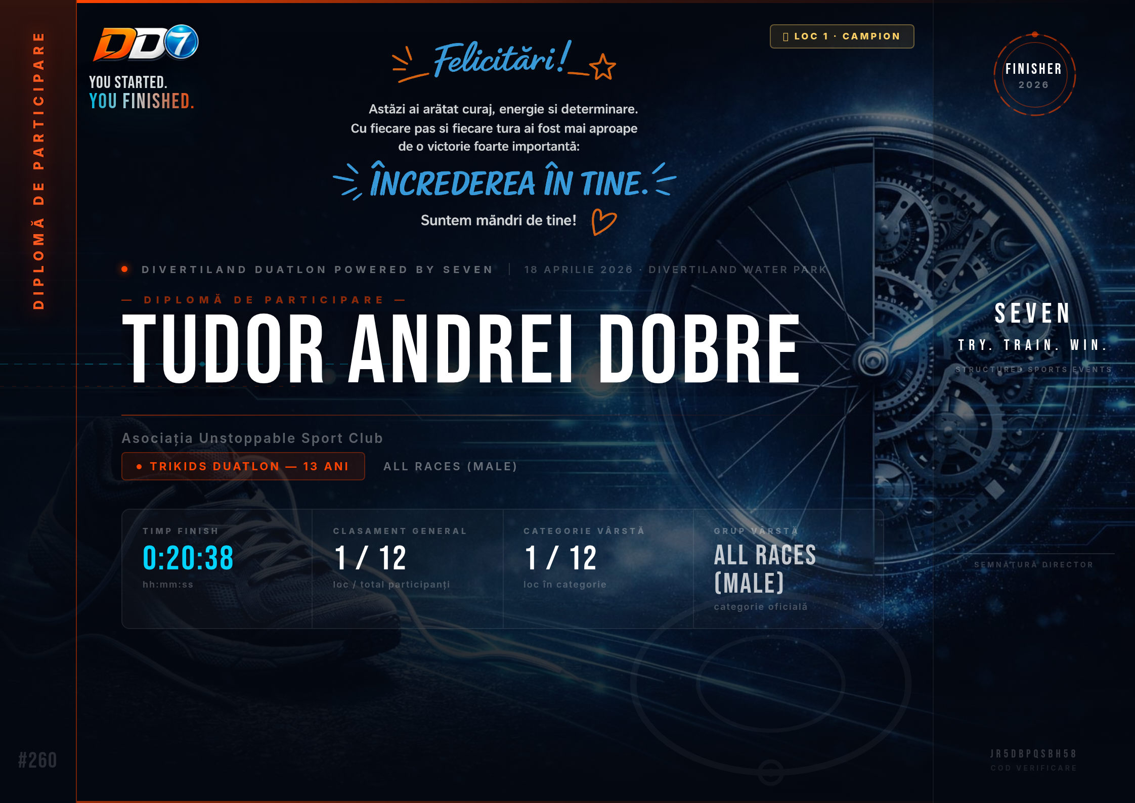 | 1 | Tudor Andrei Dobre | TRIKids 13 Ani | M | 260 | 0:04:09 | 0:00:34 | 0:12:50 | 0:03:07 | 0:20:38 | 📜 |