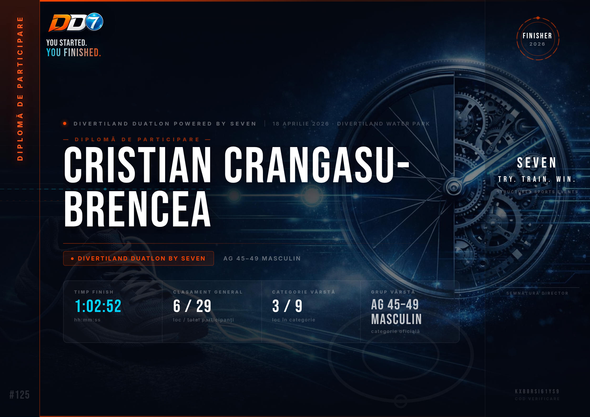 | 3 | 125 | Cristian Crangasu-Brencea | AG 45–49 Masculin | M | 0:08:46 | 0:00:58 | 0:16:31 | 0:01:04 | 0:10:20 | 0:01:06 | 0:17:31 | 0:06:40 | 1:02:52 | 📜 |