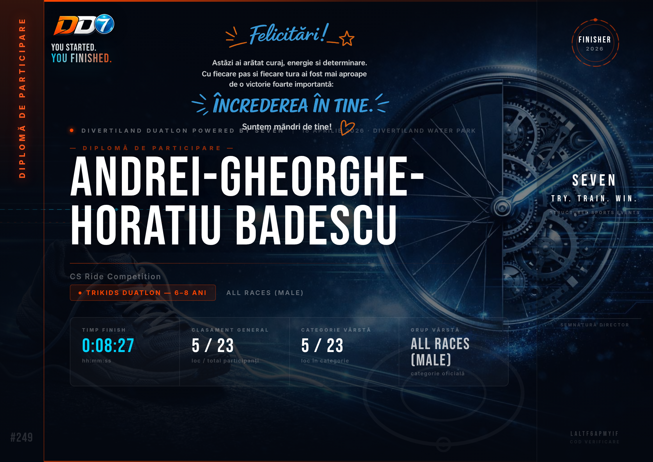 | 5 | Andrei-Gheorghe-Horatiu Badescu | TRIKids 6-8 Ani | M | 249 | 0:01:10 | 0:00:55 | 0:04:57 | 0:01:26 | 0:08:27 | 📜 |