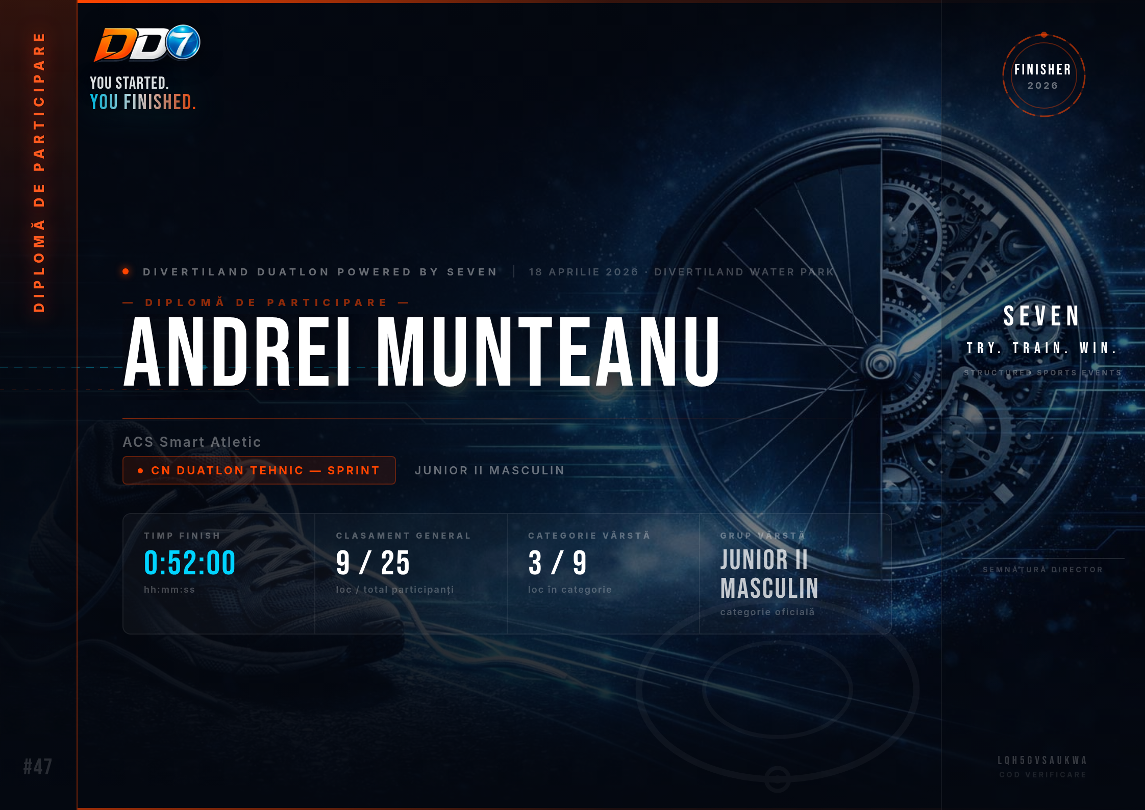 | 3 | 47 | Andrei Munteanu | Junior II Masculin | CN Duatlon Tehnic - Sprint | M | 0:07:29 | 0:00:39 | 0:14:43 | 0:00:40 | 0:08:07 | 0:00:36 | 0:15:11 | 0:04:37 | 0:52:00 | 📜 |