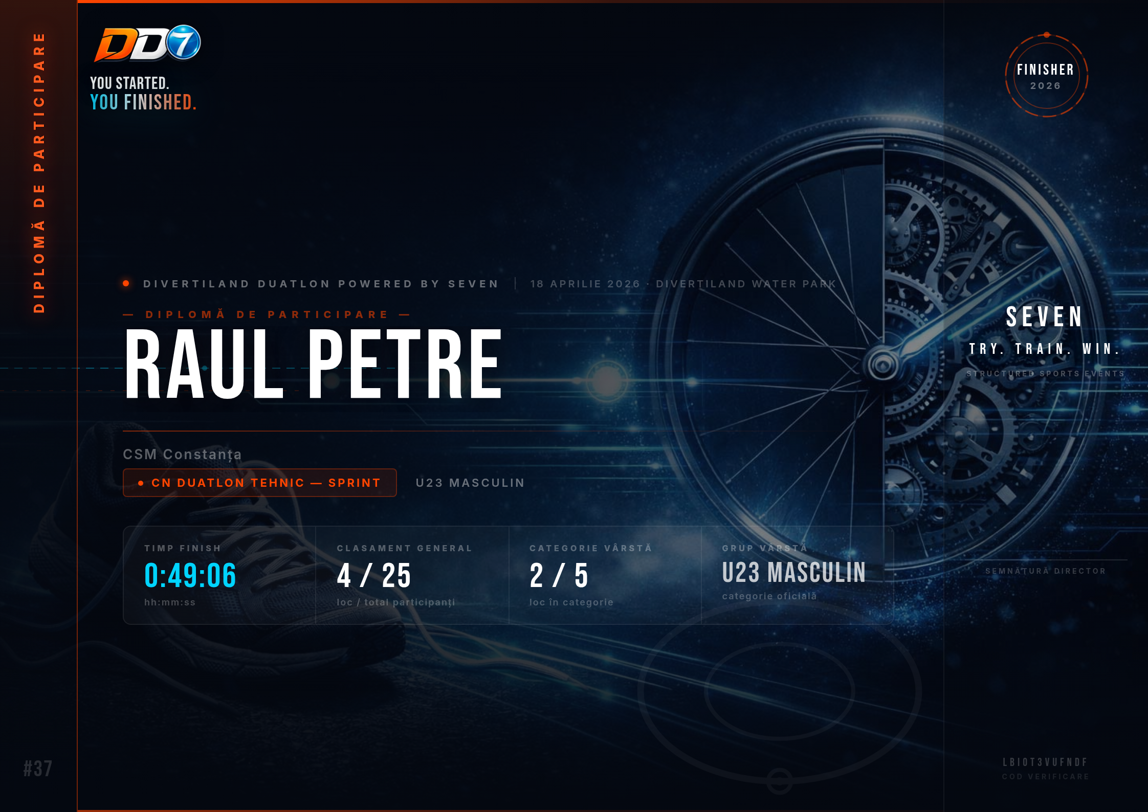 | 2 | 37 | Raul Petre | U23 Masculin | CN Duatlon Tehnic - Sprint | M | 0:06:31 | 0:00:31 | 0:13:56 | 0:00:35 | 0:07:45 | 0:00:35 | 0:14:49 | 0:04:27 | 0:49:06 | 📜 |