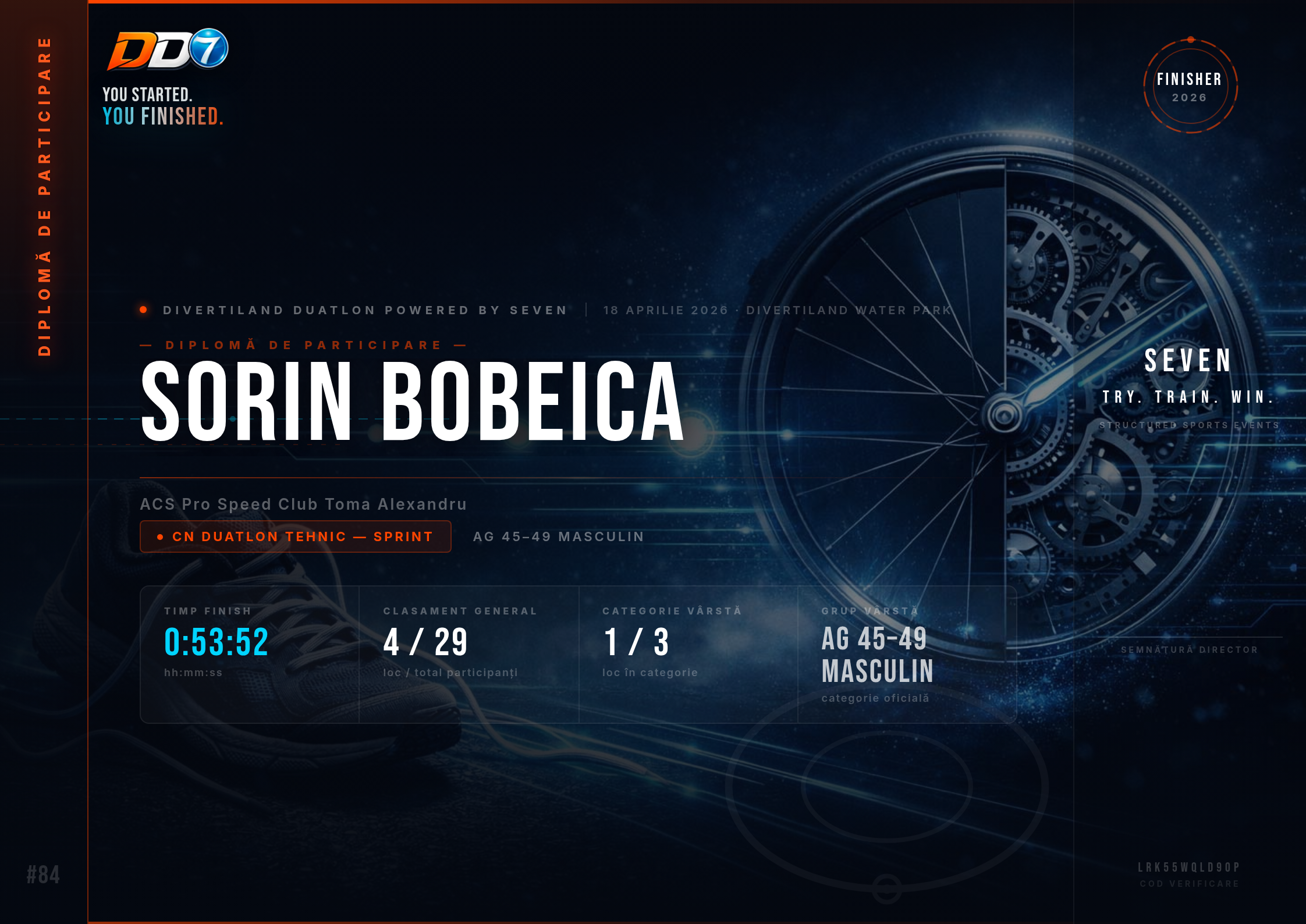 | 1 | 84 | Sorin Bobeica | AG 45–49 Masculin | CN de Duatlon Tehnic - Sprint AG | M | 0:07:46 | 0:00:50 | 0:14:50 | 0:00:50 | 0:08:34 | 0:00:48 | 0:15:03 | 0:05:15 | 0:53:52 | 📜 |