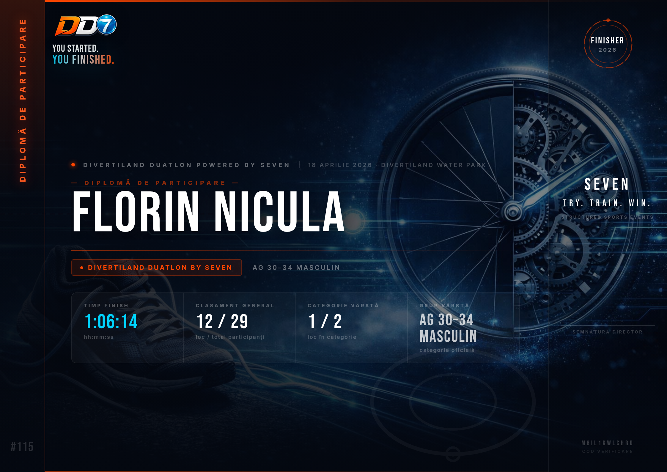 | 1 | 115 | Florin Nicula | AG 30–34 Masculin | M | 0:09:55 | 0:00:47 | 0:17:52 | 0:00:47 | 0:10:52 | 0:00:50 | 0:19:00 | 0:06:16 | 1:06:14 | 📜 |