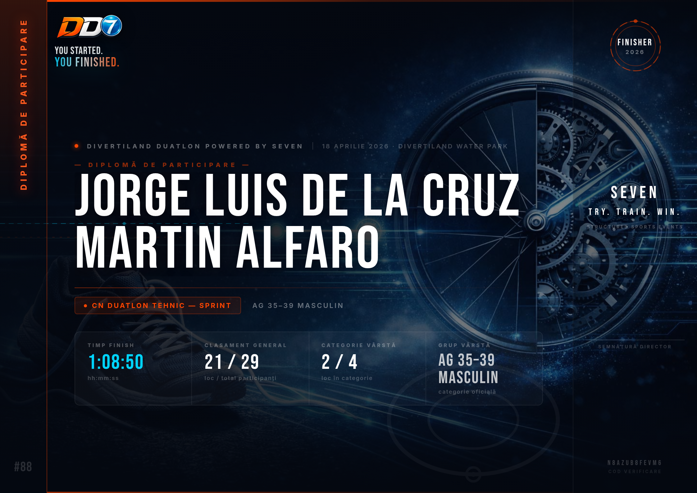 | 2 | 88 | Jorge Luis de la Cruz Martin Alfaro | AG 35–39 Masculin | CN de Duatlon Tehnic - Sprint AG | M | 0:10:39 | 0:00:54 | 0:18:25 | 0:00:53 | 0:12:46 | 0:00:56 | 0:18:57 | 0:05:23 | 1:08:50 | 📜 |