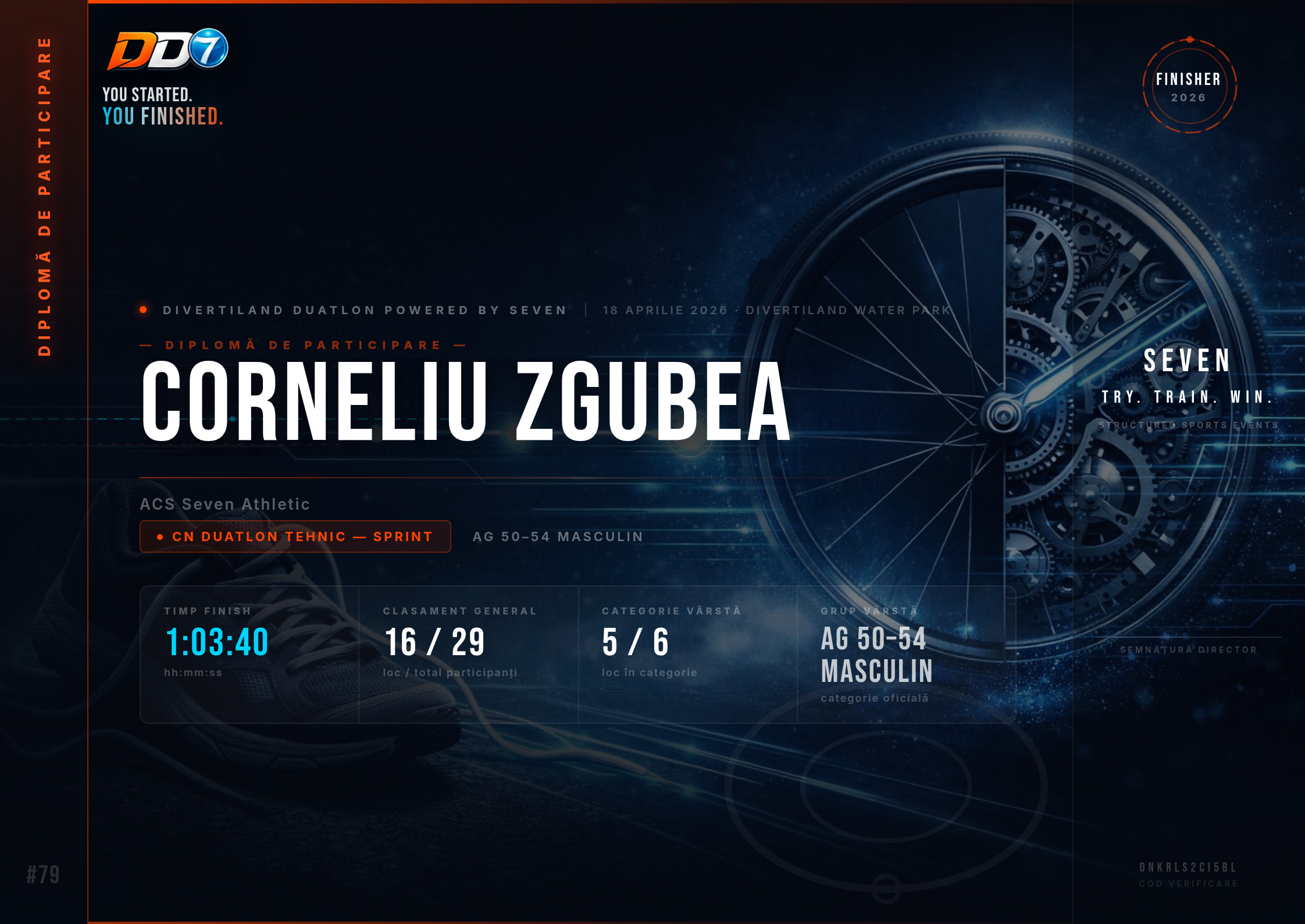| 5 | 79 | Corneliu Zgubea | AG 50–54 Masculin | CN de Duatlon Tehnic - Sprint AG | M | 0:09:50 | 0:00:55 | 0:17:00 | 0:00:57 | 0:10:33 | 0:00:56 | 0:17:11 | 0:06:22 | 1:03:40 | 📜 |