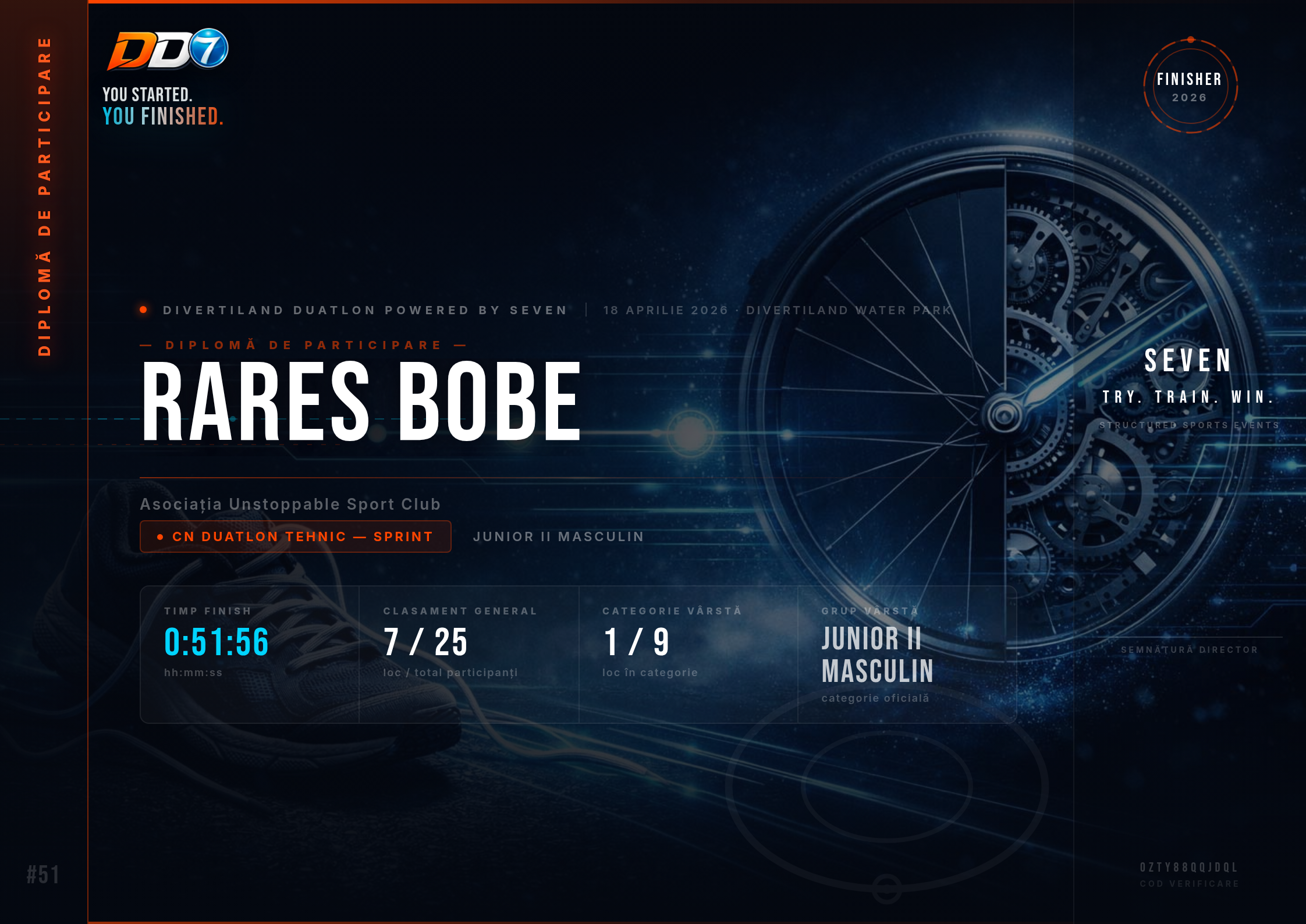 | 1 | 51 | Rares Bobe | Junior II Masculin | CN Duatlon Tehnic - Sprint | M | 0:07:18 | 0:00:38 | 0:14:58 | 0:00:36 | 0:08:09 | 0:00:33 | 0:15:14 | 0:04:34 | 0:51:56 | 📜 |