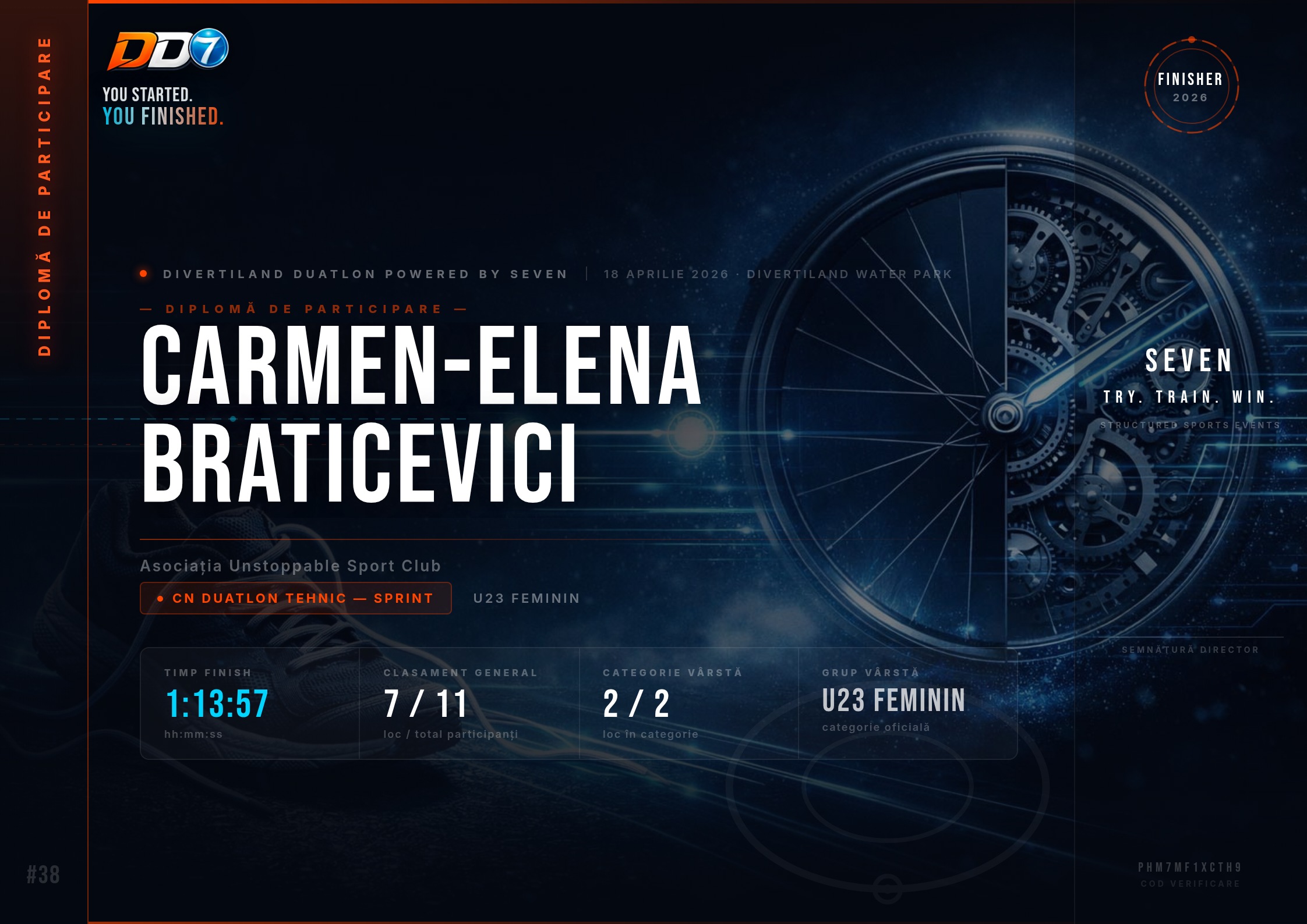 | 2 | 38 | Carmen-Elena Braticevici | U23 Feminin | CN Duatlon Tehnic - Sprint | F | 0:11:03 | 0:01:02 | 0:19:41 | 0:00:56 | 0:12:22 | 0:01:07 | 0:20:12 | 0:07:38 | 1:13:57 | 📜 |