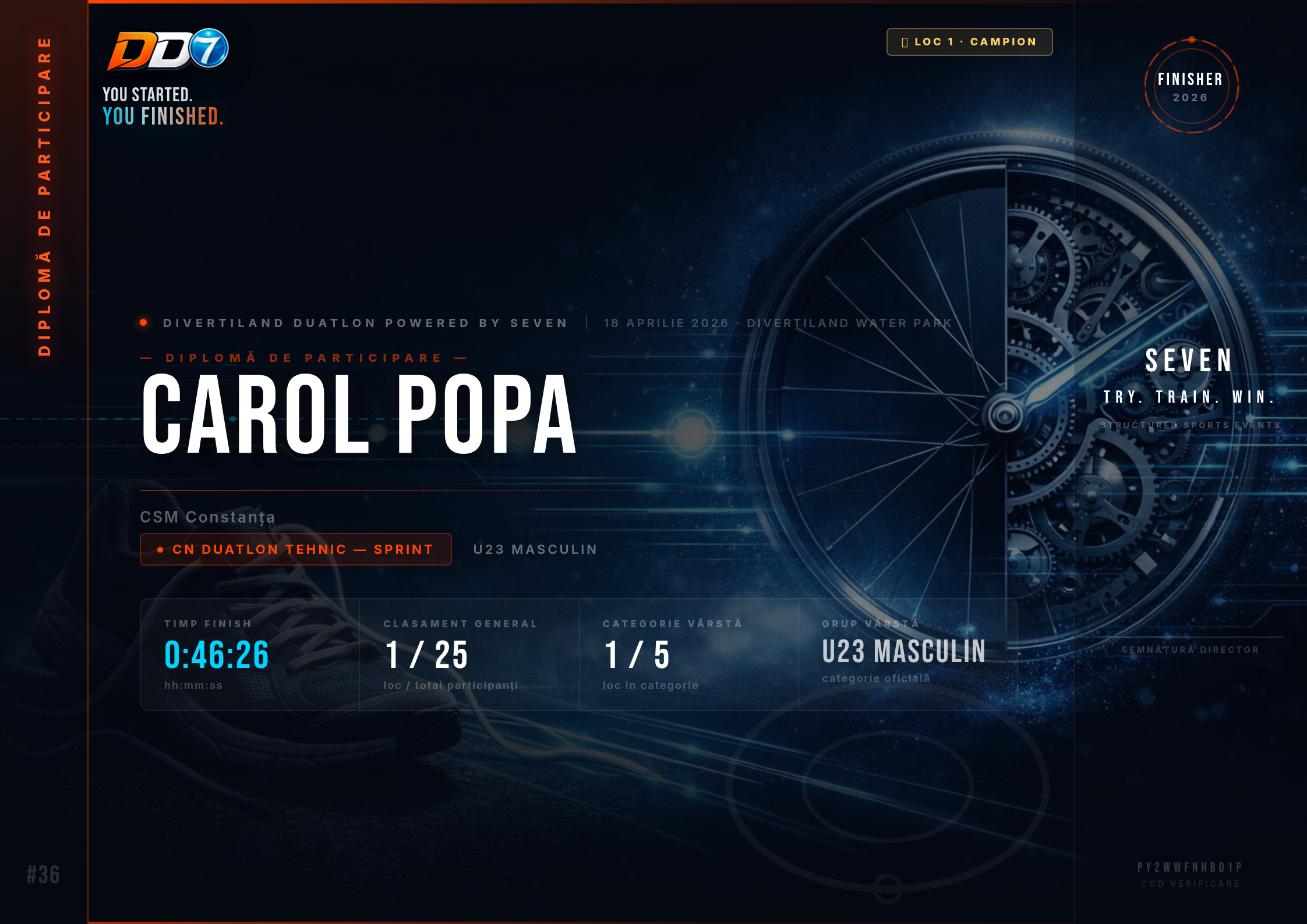 | 1 | 36 | Carol Popa | U23 Masculin | CN Duatlon Tehnic - Sprint | M | 0:06:26 | 0:00:31 | 0:13:59 | 0:00:35 | 0:06:32 | 0:00:32 | 0:13:41 | 0:04:15 | 0:46:26 | 📜 |