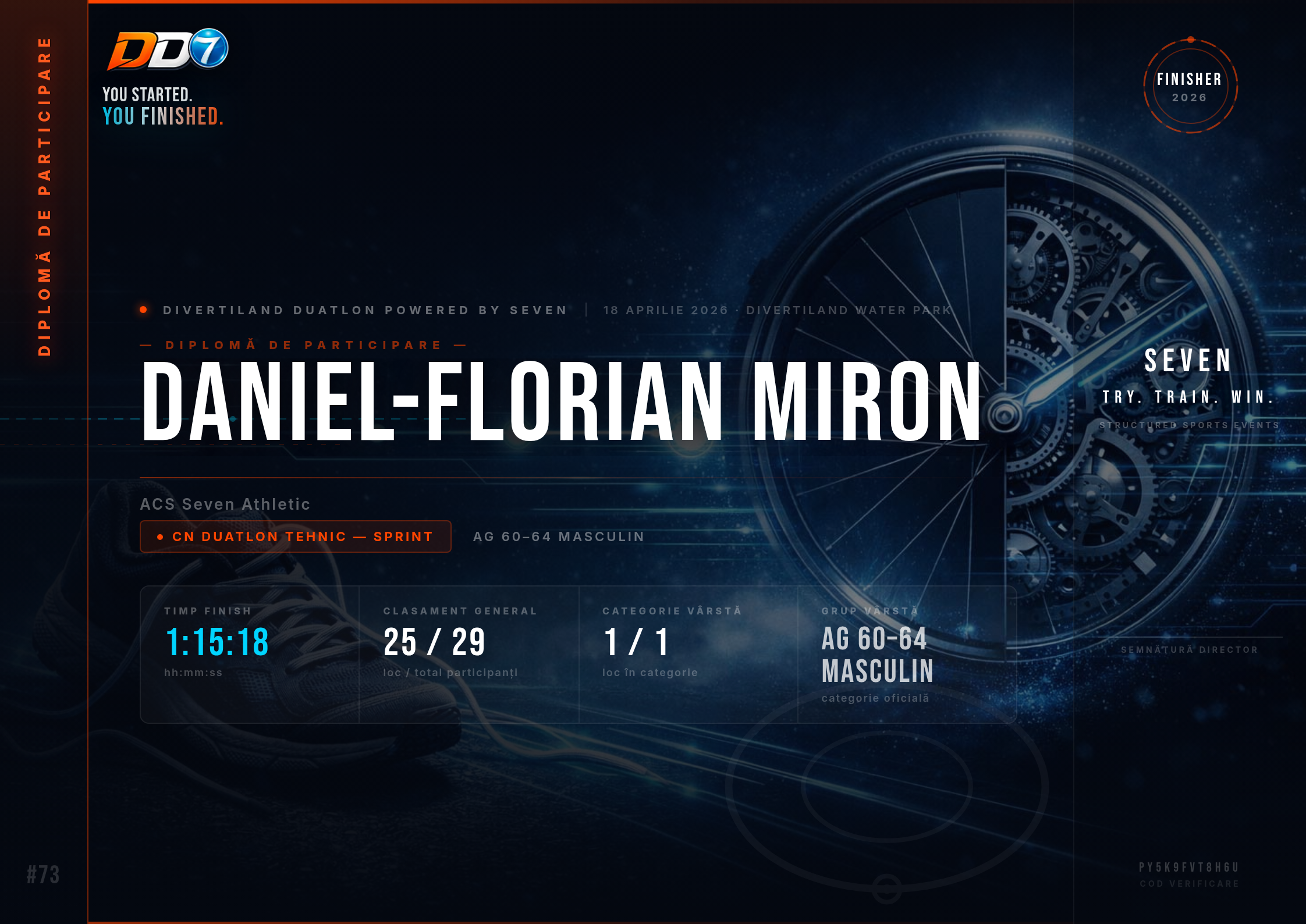 | 1 | 73 | Daniel-Florian Miron | AG 60–64 Masculin | CN de Duatlon Tehnic - Sprint AG | M | 0:11:16 | 0:01:07 | 0:18:07 | 0:01:17 | 0:13:55 | 0:01:21 | 0:19:35 | 0:08:43 | 1:15:18 | 📜 |