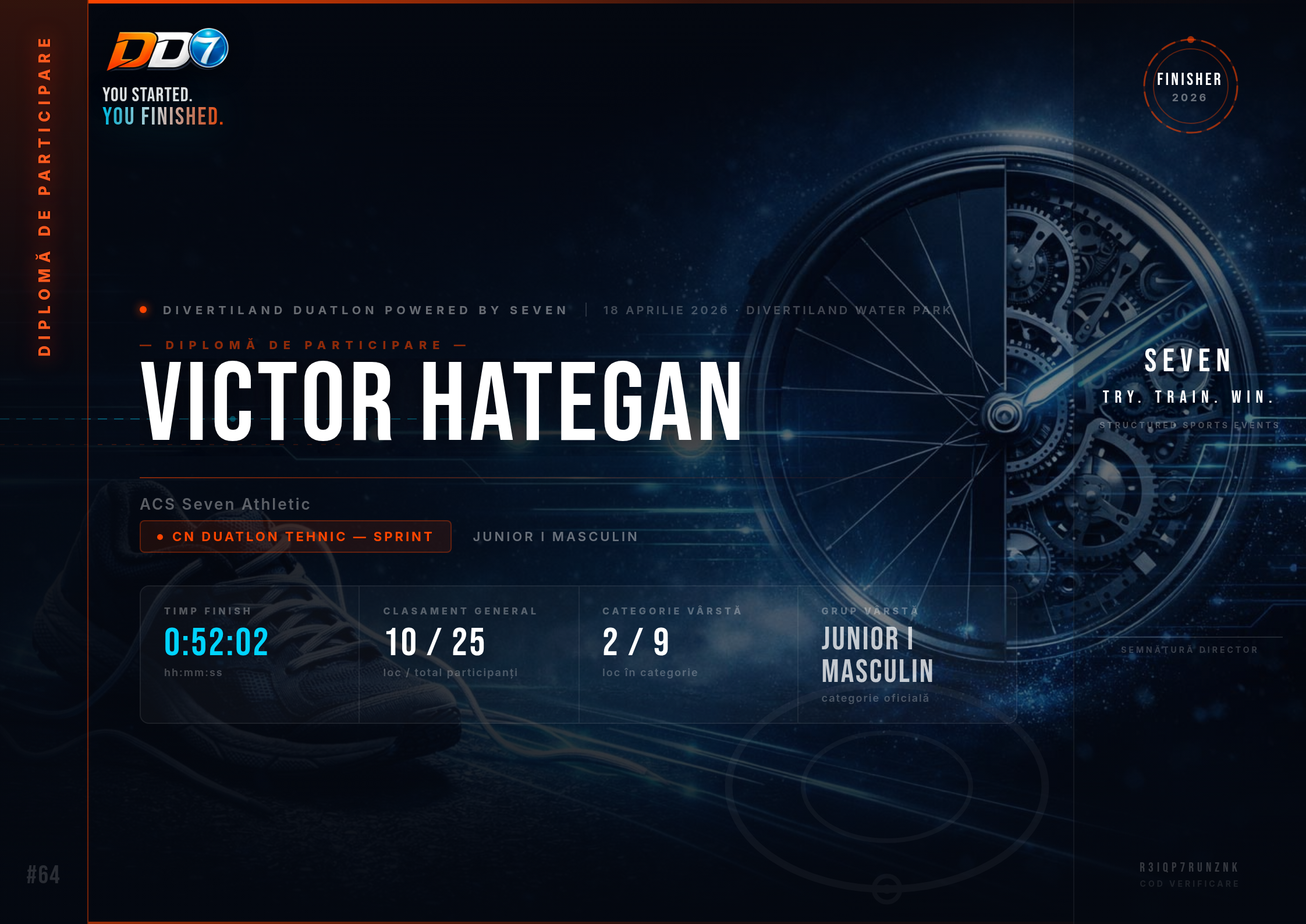 | 2 | 64 | Victor Hategan | Junior I Masculin | CN Duatlon Tehnic - Sprint | M | 0:07:17 | 0:00:37 | 0:14:56 | 0:00:40 | 0:08:08 | 0:00:35 | 0:15:11 | 0:04:40 | 0:52:02 | 📜 |