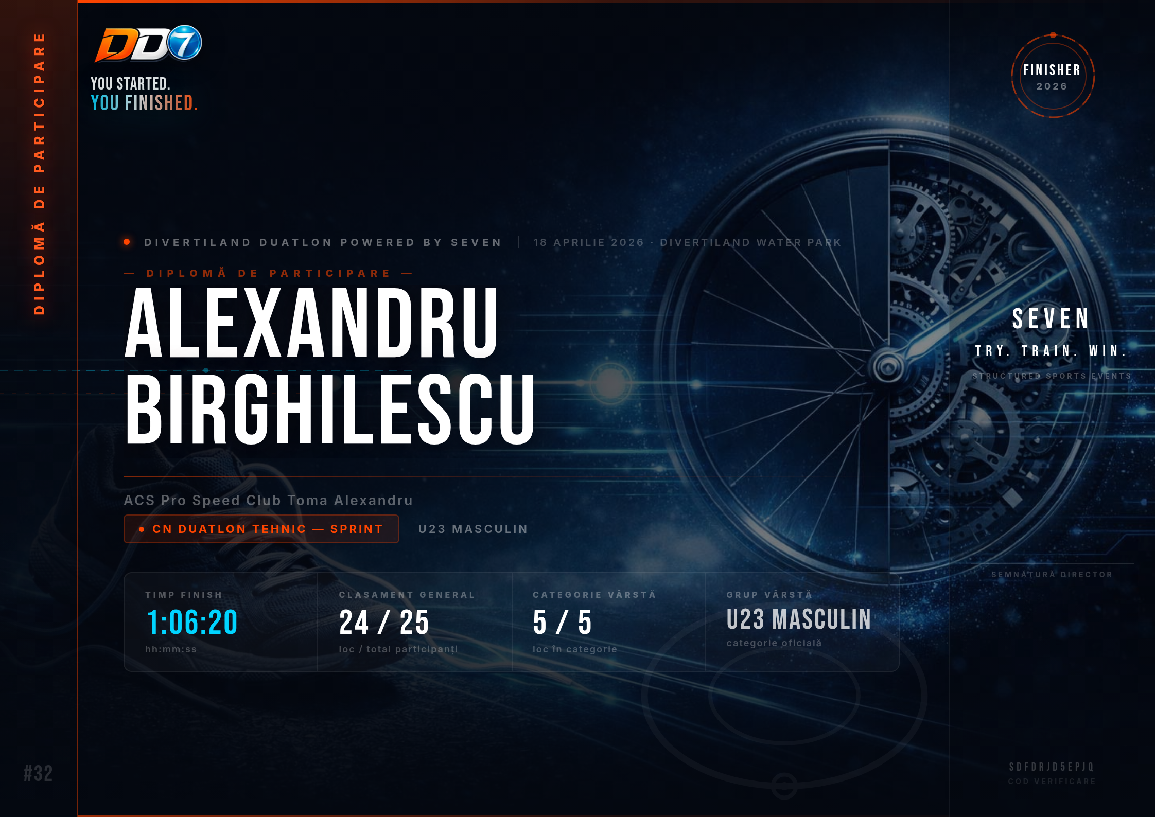 | 5 | 32 | Alexandru Birghilescu | U23 Masculin | CN Duatlon Tehnic - Sprint | M | 0:09:03 | 0:00:52 | 0:18:23 | 0:00:55 | 0:11:20 | 0:00:57 | 0:18:26 | 0:06:28 | 1:06:20 | 📜 |