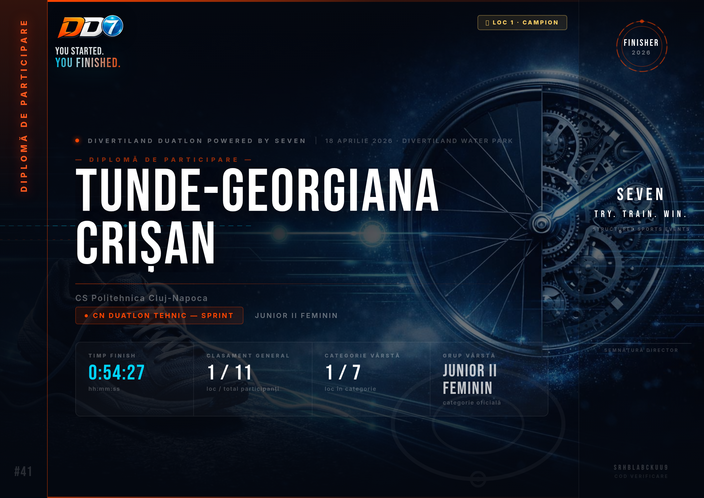 | 1 | 41 | TUNDE-GEORGIANA CRIȘAN | Junior II Feminin | CN Duatlon Tehnic - Sprint | F | 0:07:42 | 0:00:34 | 0:15:56 | 0:00:37 | 0:08:21 | 0:00:38 | 0:16:01 | 0:04:43 | 0:54:27 | 📜 |