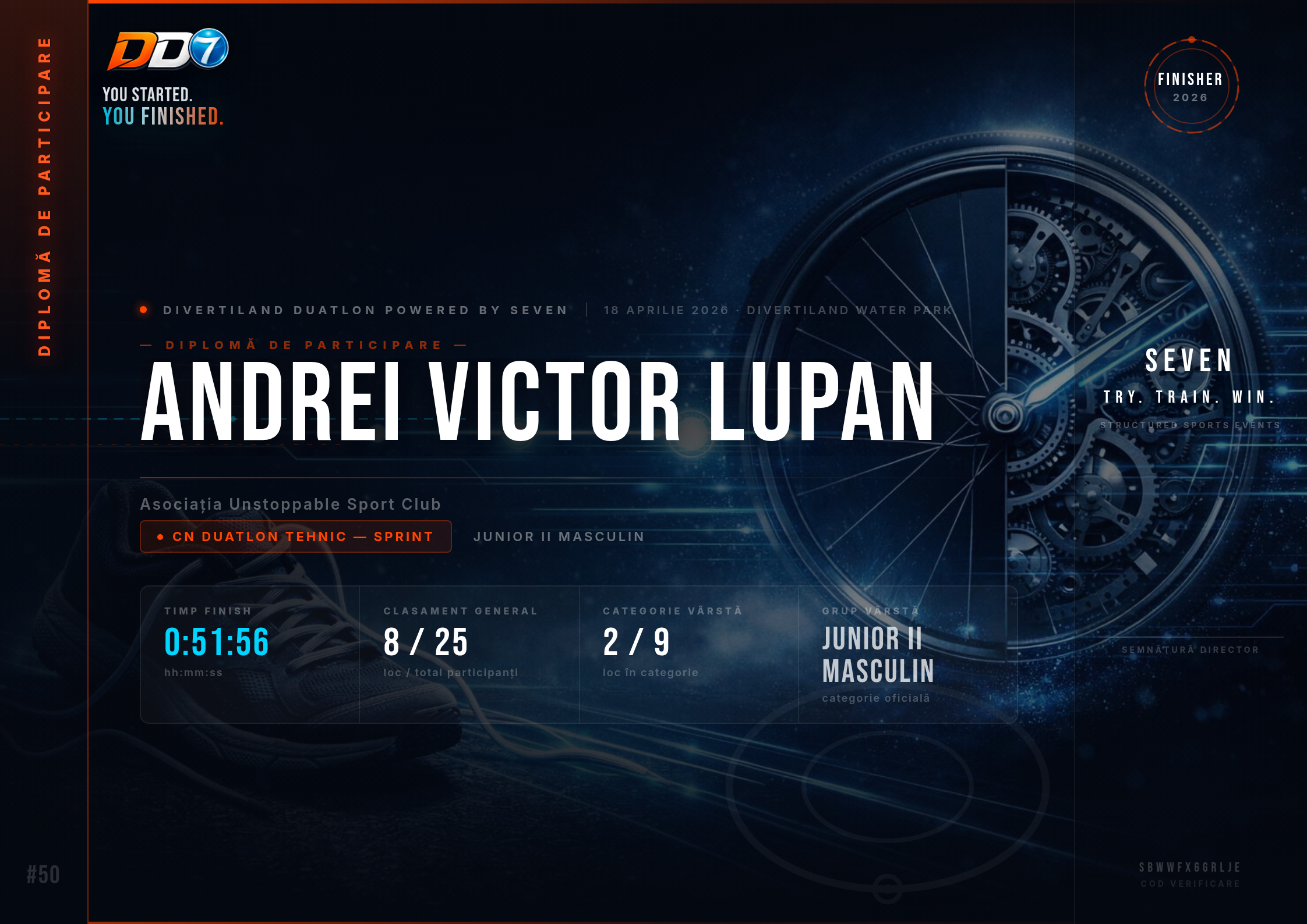 | 2 | 50 | Andrei Victor Lupan | Junior II Masculin | CN Duatlon Tehnic - Sprint | M | 0:07:17 | 0:00:35 | 0:15:03 | 0:00:37 | 0:08:06 | 0:00:33 | 0:15:19 | 0:04:30 | 0:51:56 | 📜 |