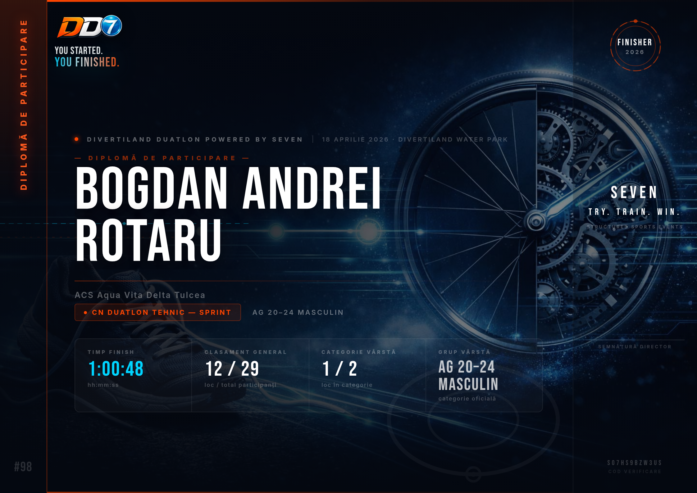 | 1 | 98 | Bogdan Andrei Rotaru | AG 20–24 Masculin | CN de Duatlon Tehnic - Sprint AG | M | 0:08:38 | 0:01:02 | 0:15:35 | 0:00:57 | 0:10:29 | 0:01:03 | 0:17:00 | 0:06:09 | 1:00:48 | 📜 |