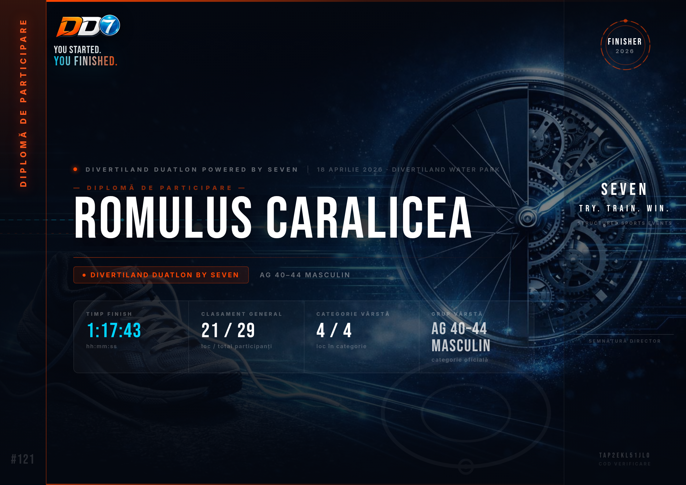 | 4 | 121 | Romulus Caralicea | AG 40–44 Masculin | M | 0:10:10 | 0:00:56 | 0:22:06 | 0:01:07 | 0:12:06 | 0:01:08 | 0:22:55 | 0:07:20 | 1:17:43 | 📜 |