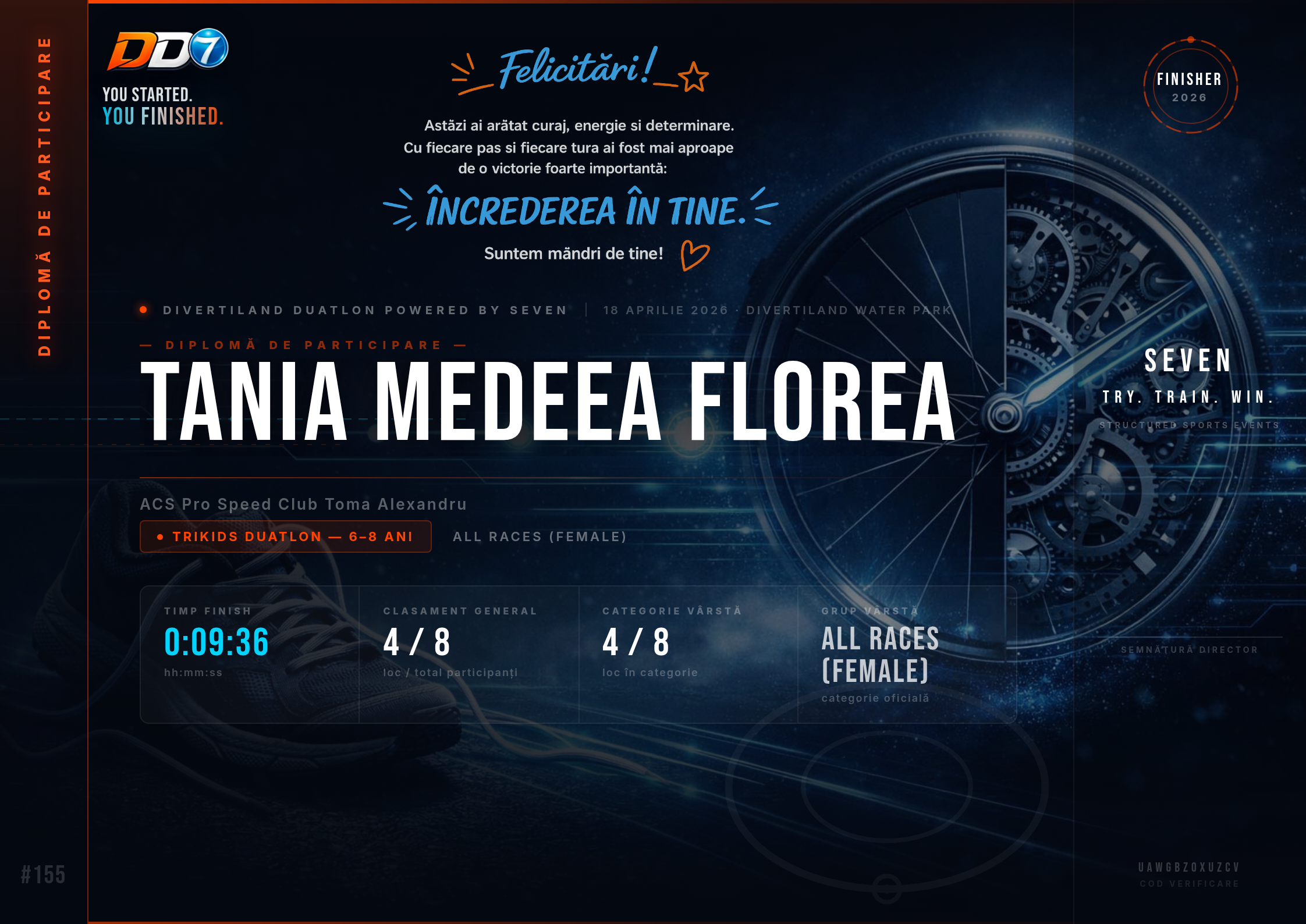 | 4 | Tania Medeea Florea | TRIKids 6-8 Ani | F | 155 | 0:01:14 | 0:00:51 | 0:06:03 | 0:01:30 | 0:09:36 | 📜 |