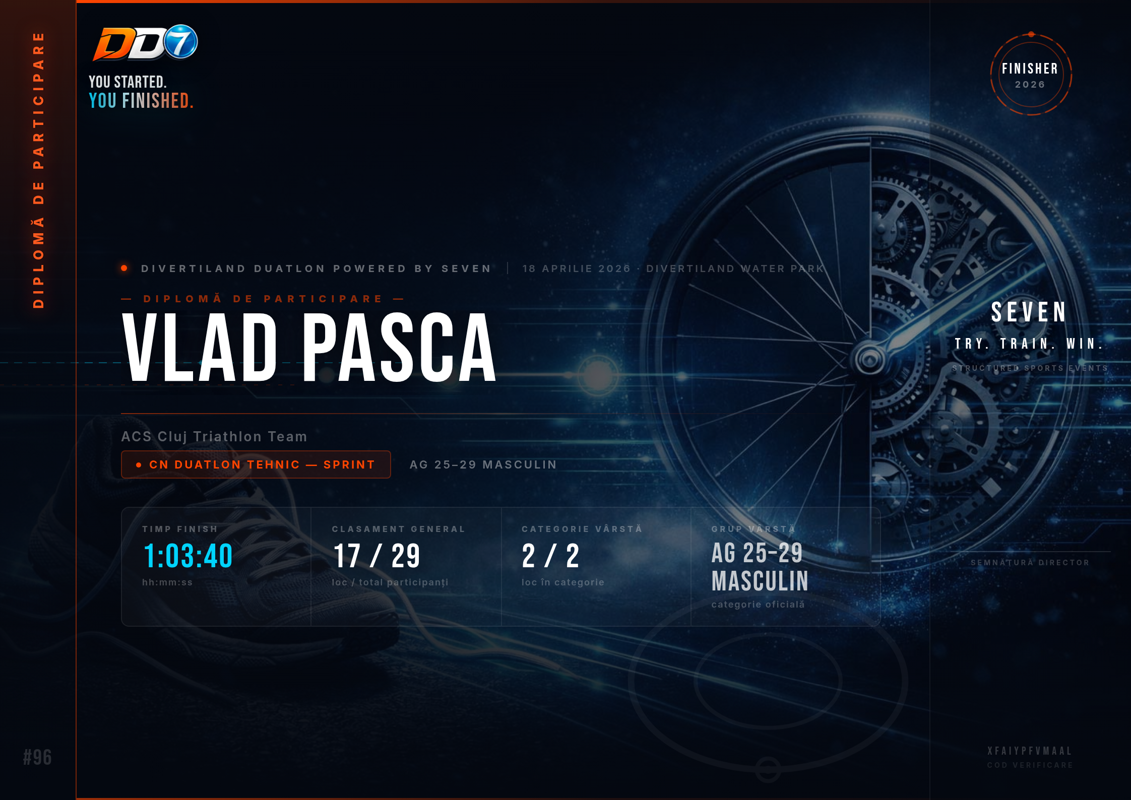 | 2 | 96 | Vlad Pasca | AG 25–29 Masculin | CN de Duatlon Tehnic - Sprint AG | M | 0:09:27 | 0:01:00 | 0:16:30 | 0:00:54 | 0:11:03 | 0:01:05 | 0:17:15 | 0:06:29 | 1:03:40 | 📜 |