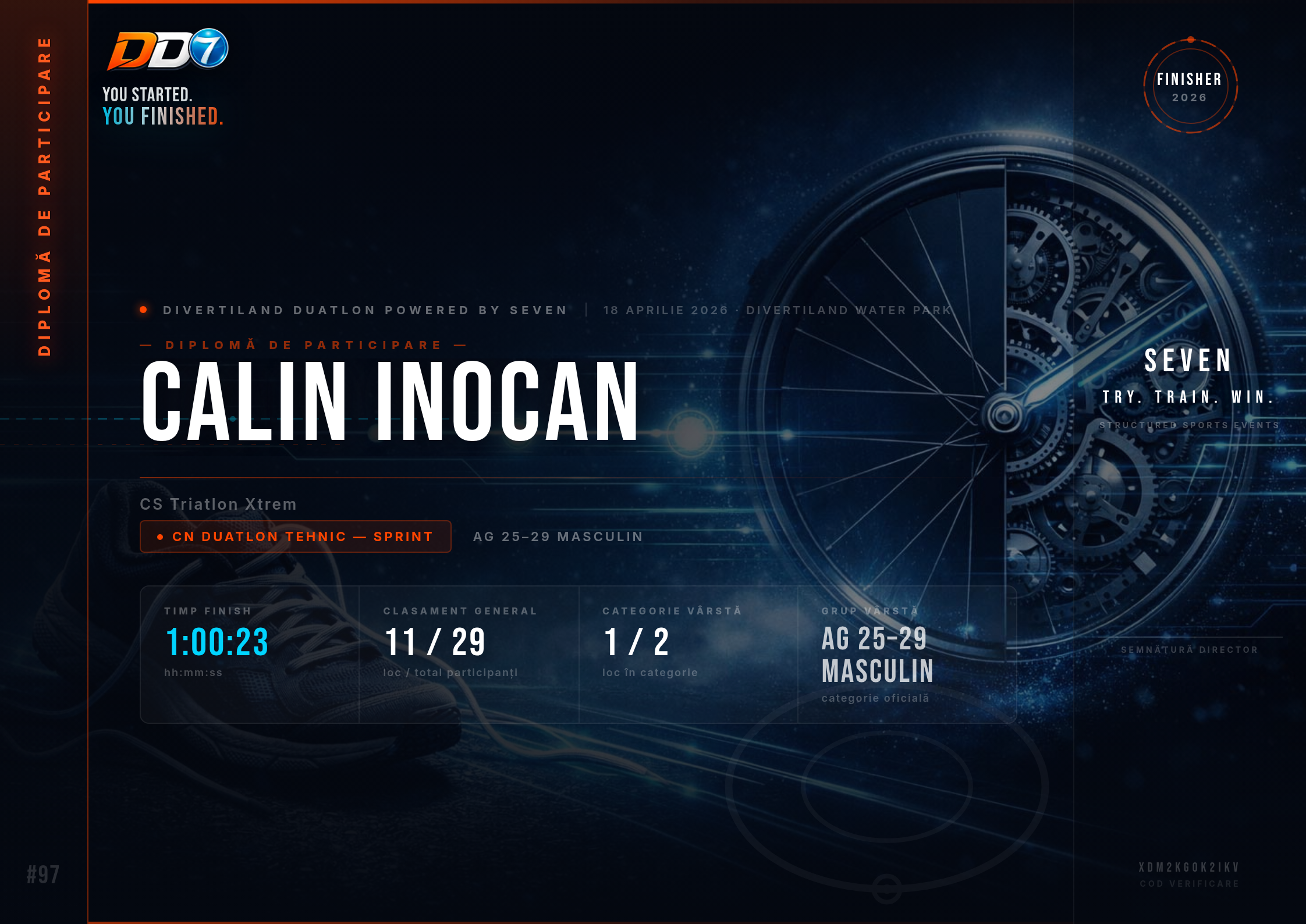 | 1 | 97 | Calin Inocan | AG 25–29 Masculin | CN de Duatlon Tehnic - Sprint AG | M | 0:09:00 | 0:00:59 | 0:22:26 | 0:00:37 | 0:14:43 | 0:00:16 | 1:00:23 | 📜 | ||