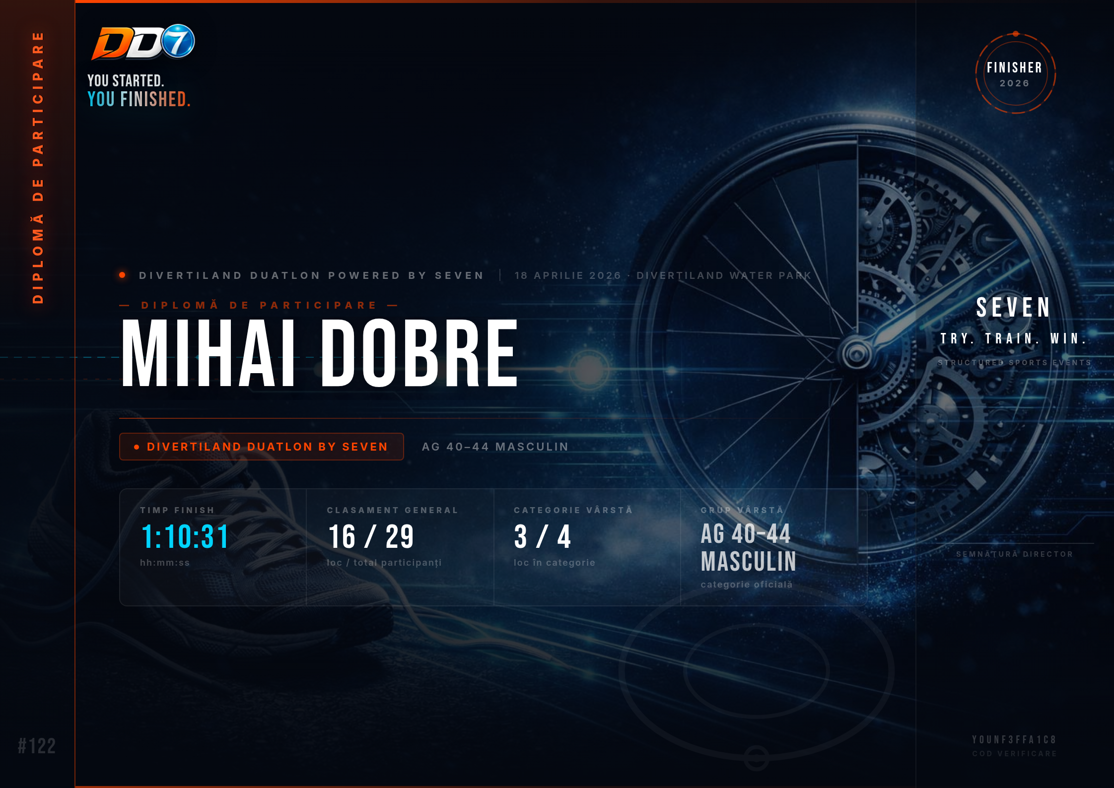 | 3 | 122 | Mihai Dobre | AG 40–44 Masculin | M | 0:10:44 | 0:00:54 | 0:18:24 | 0:00:49 | 0:12:09 | 0:00:53 | 0:19:13 | 0:07:29 | 1:10:31 | 📜 |