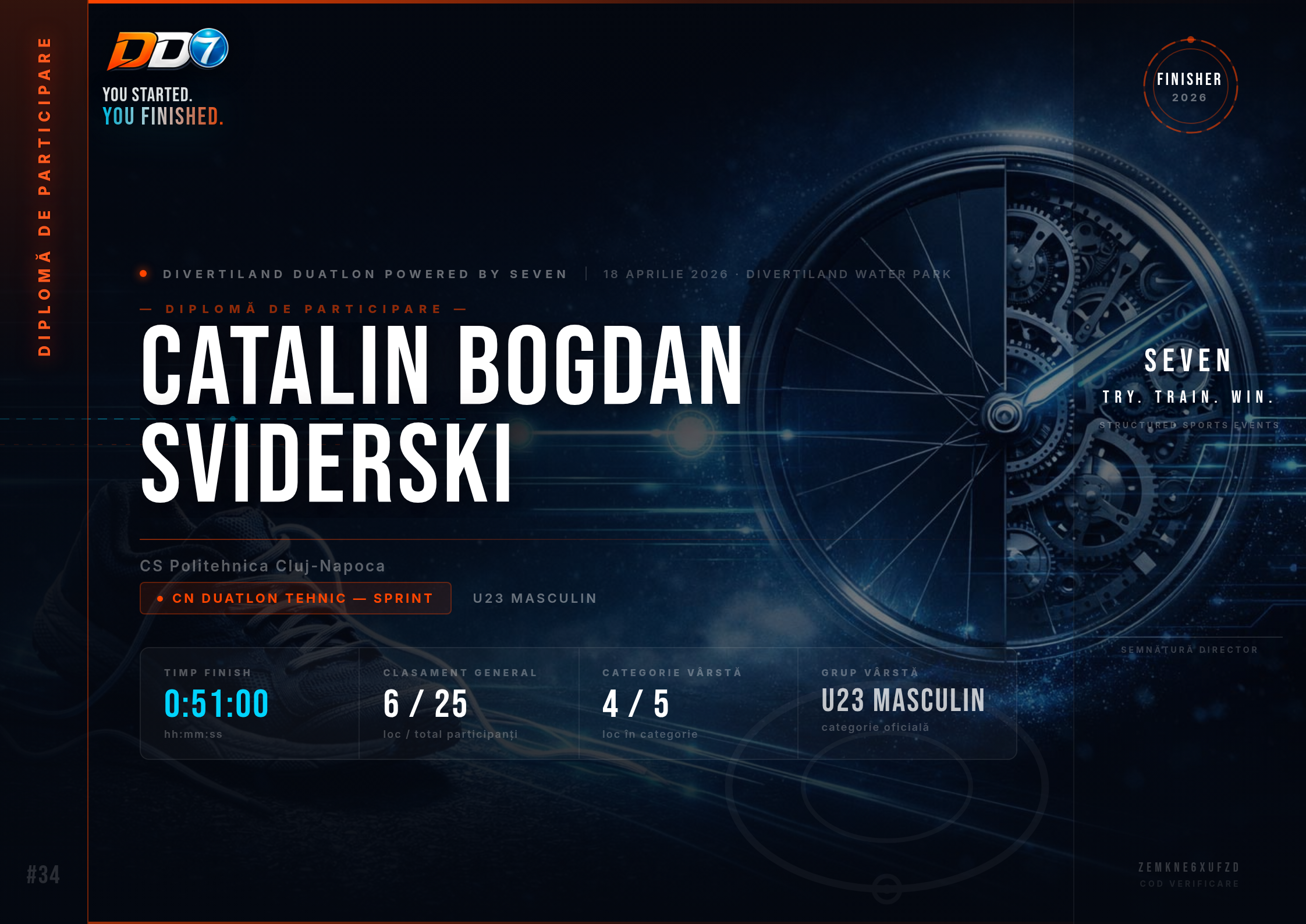| 4 | 34 | Catalin Bogdan Sviderski | U23 Masculin | CN Duatlon Tehnic - Sprint | M | 0:06:51 | 0:00:34 | 0:14:57 | 0:00:41 | 0:07:28 | 0:00:36 | 0:15:20 | 0:04:37 | 0:51:00 | 📜 |