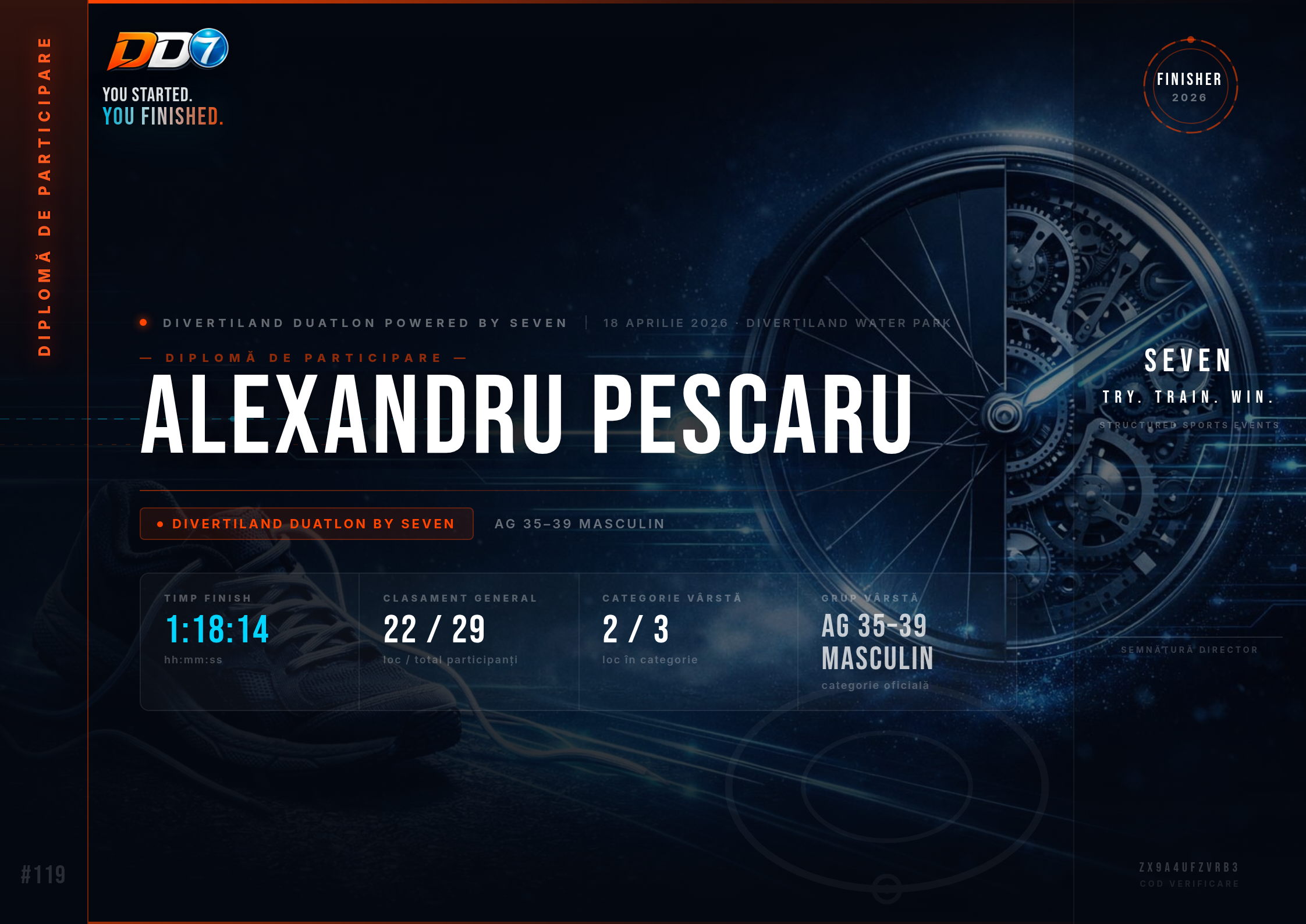 | 2 | 119 | Alexandru Pescaru | AG 35–39 Masculin | M | 0:10:46 | 0:00:51 | 0:20:56 | 0:02:05 | 0:12:30 | 0:00:51 | 0:22:45 | 0:07:33 | 1:18:14 | 📜 |